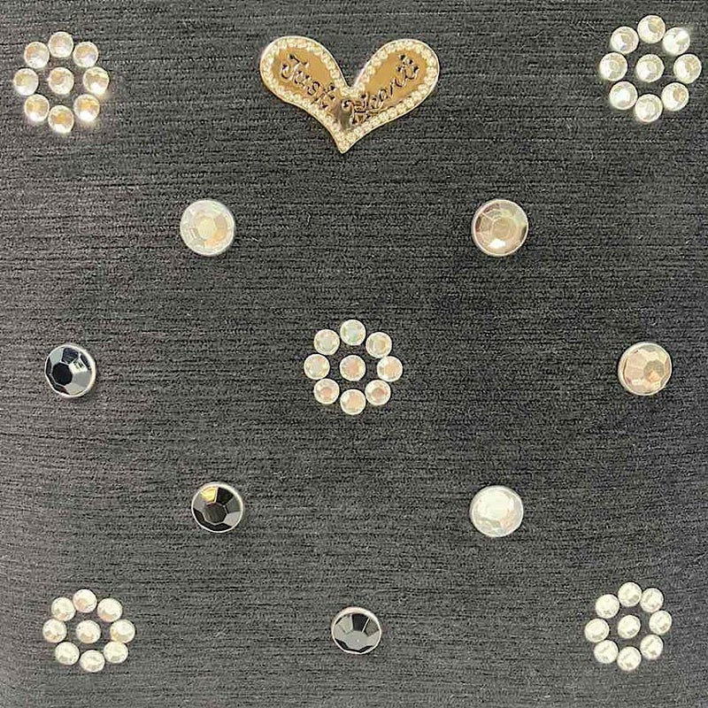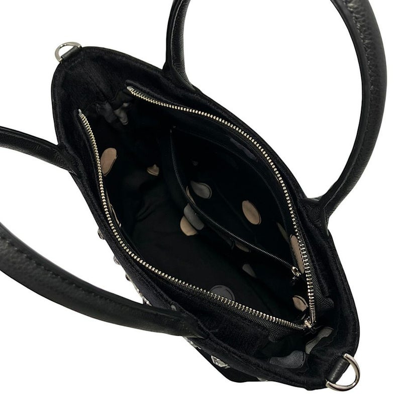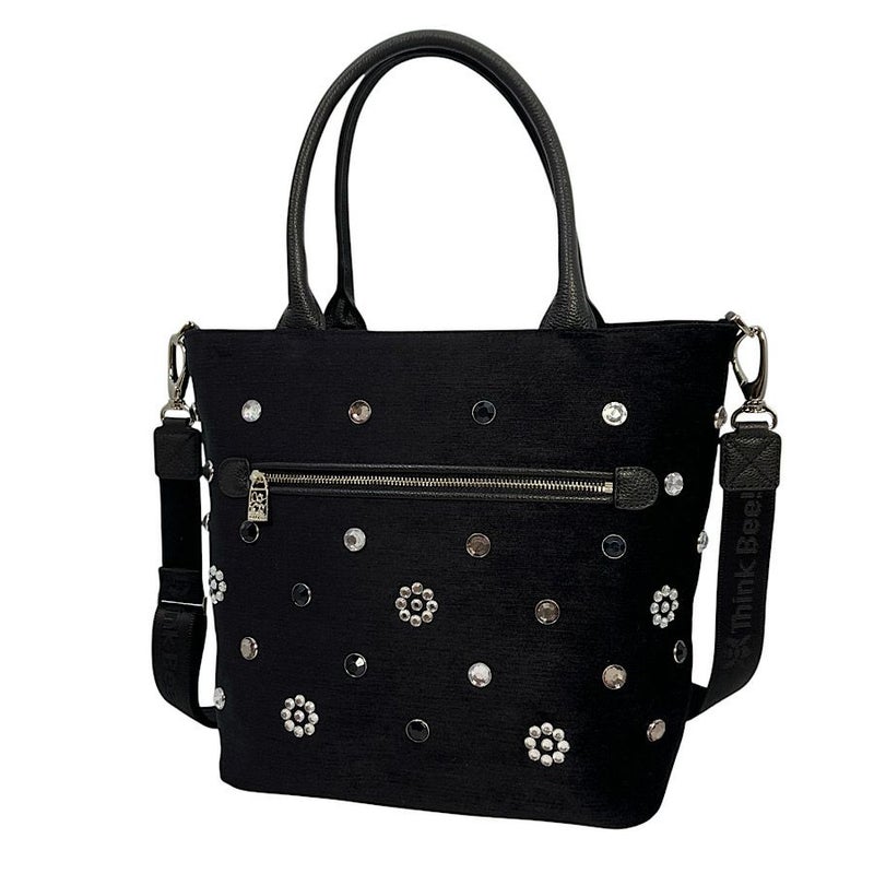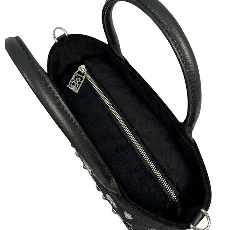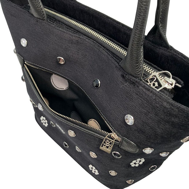 柔らかなブラック地に、大粒のラインストーンとスタッズを贅沢にあしらったデコレーション。