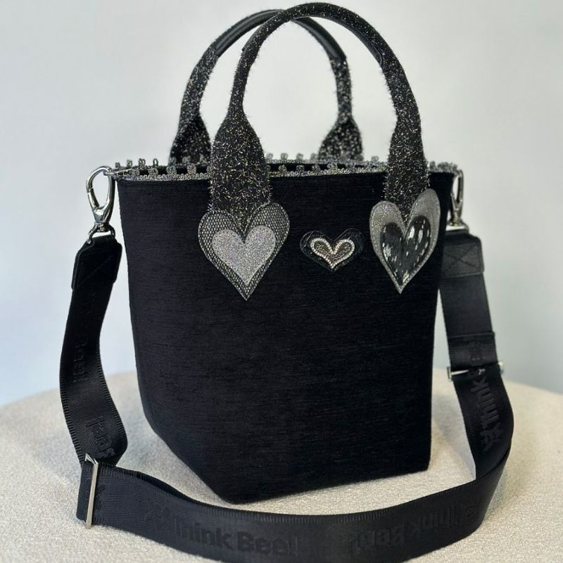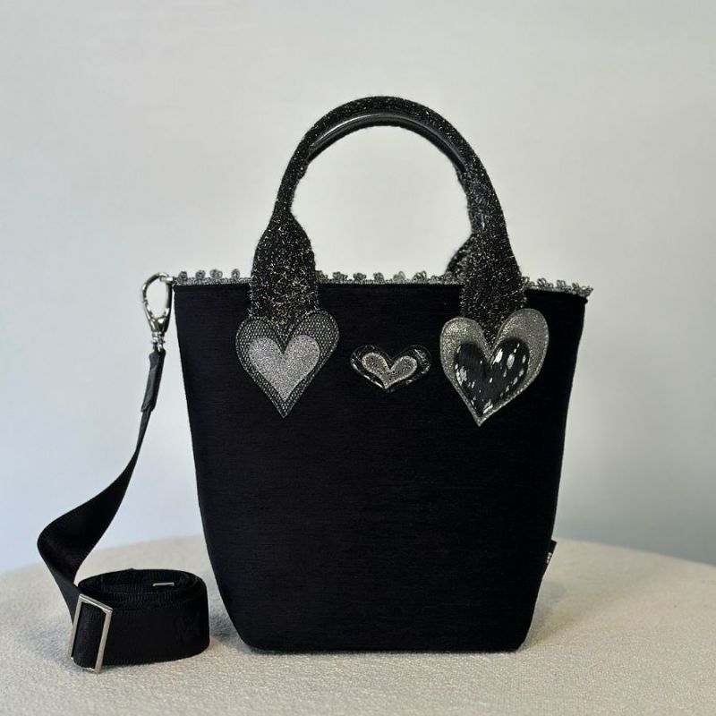 ハンドルとボディの接続部分には、グリッター素材のシルバーのハートを二つあしらい、ポイントとしてさりげない煌めきをプラス。 真っ黒な本体がシルバーの質感をより際立たせ、部分的に光るディテールを楽しめる仕上がりです。