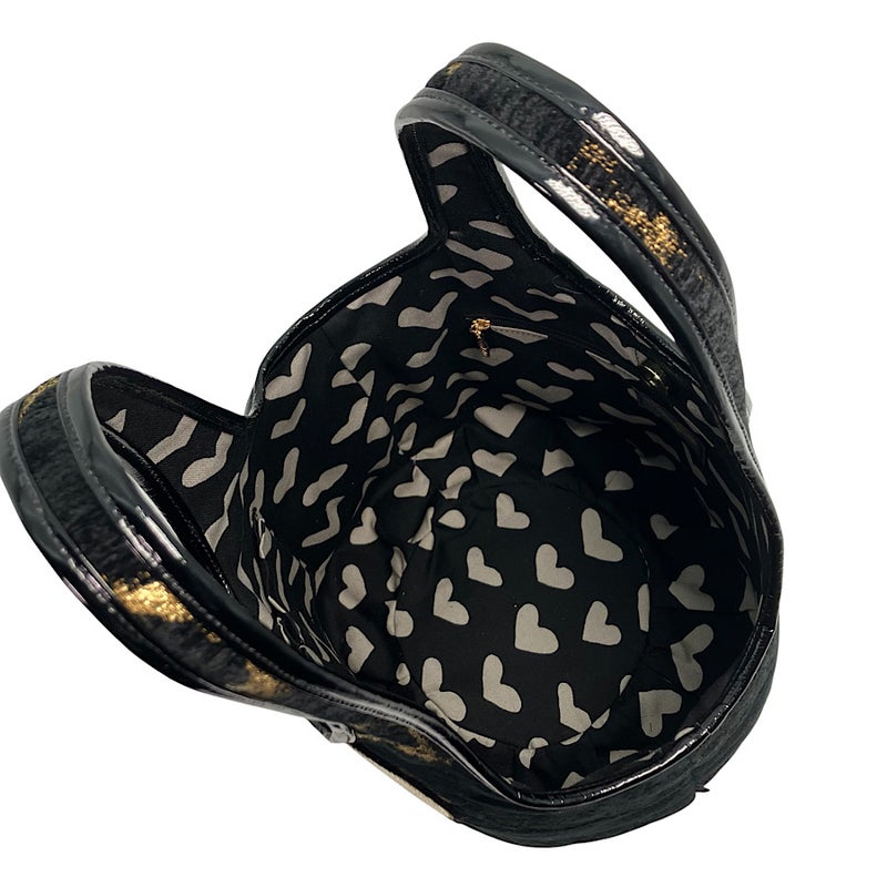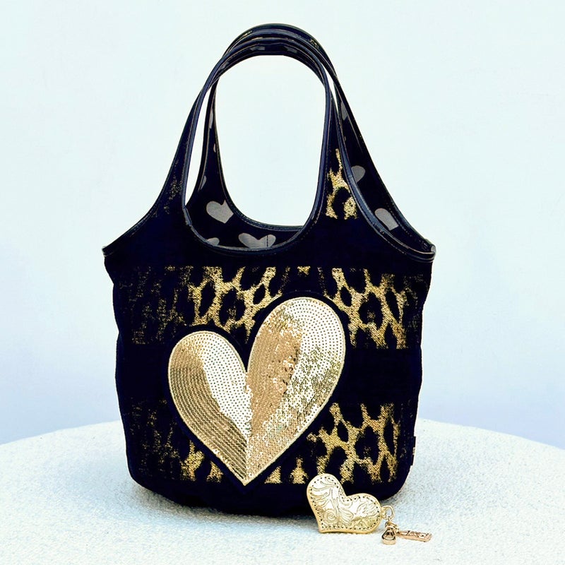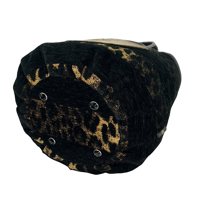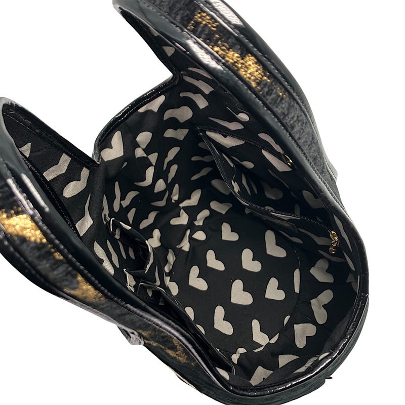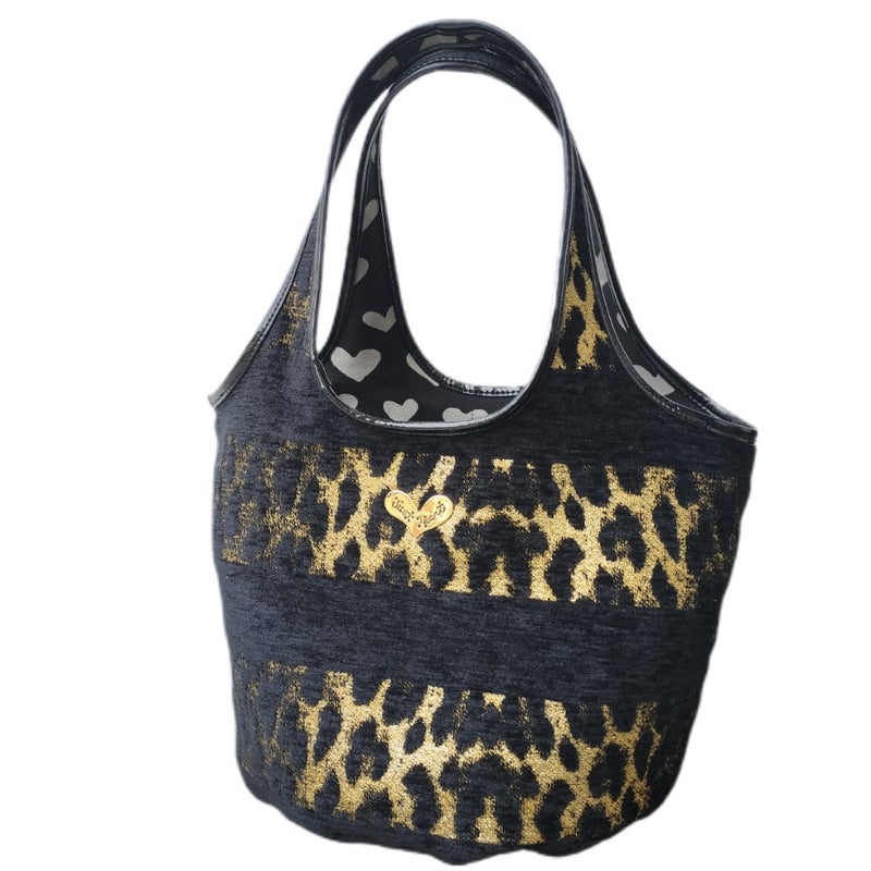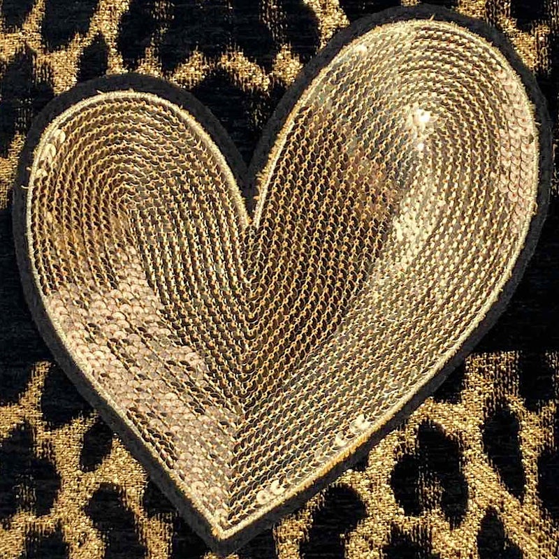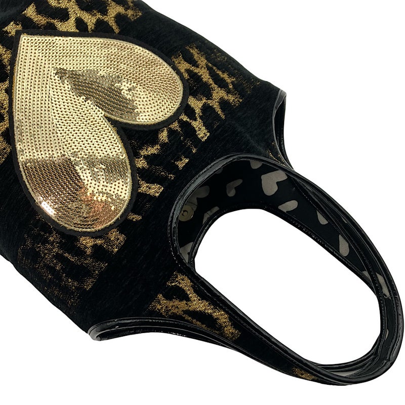 ゴールドレオパードとブラックの横ストライプをベースに、ゴールドのスパンコールハートを縫い付けた印象的な作品です。
