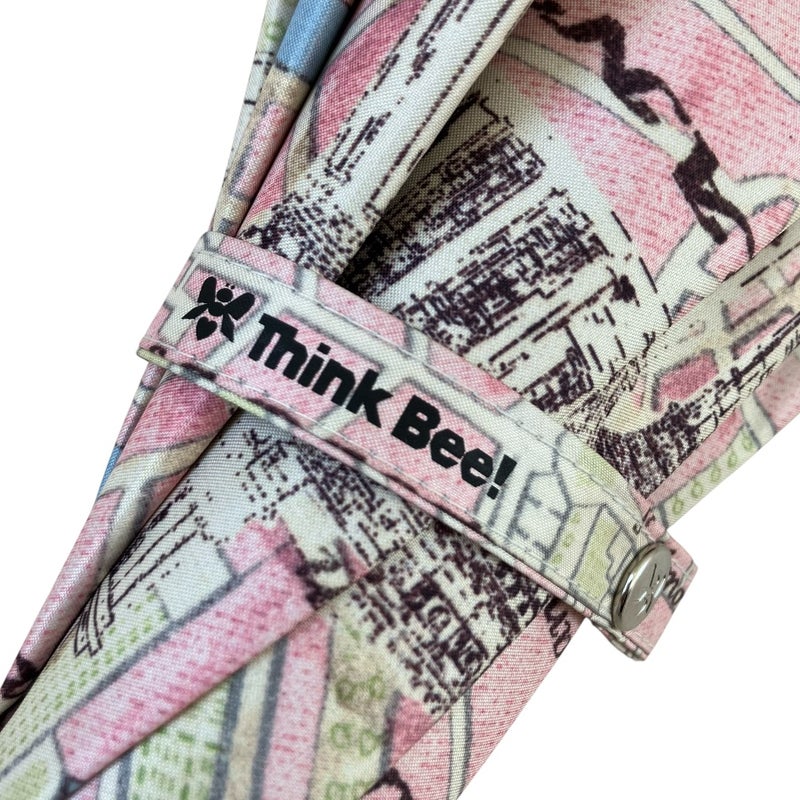 表布はもちろん裏布もオリジナル。傘を開けると遊び心たっぷりのドット柄にThink Bee!のロゴをあしらいました。