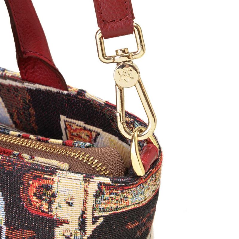 落ち着いたレッドとゴールドパーツのコンビネーションで華やかさもあり、カジュアルな柄でありながら洗練された印象に。