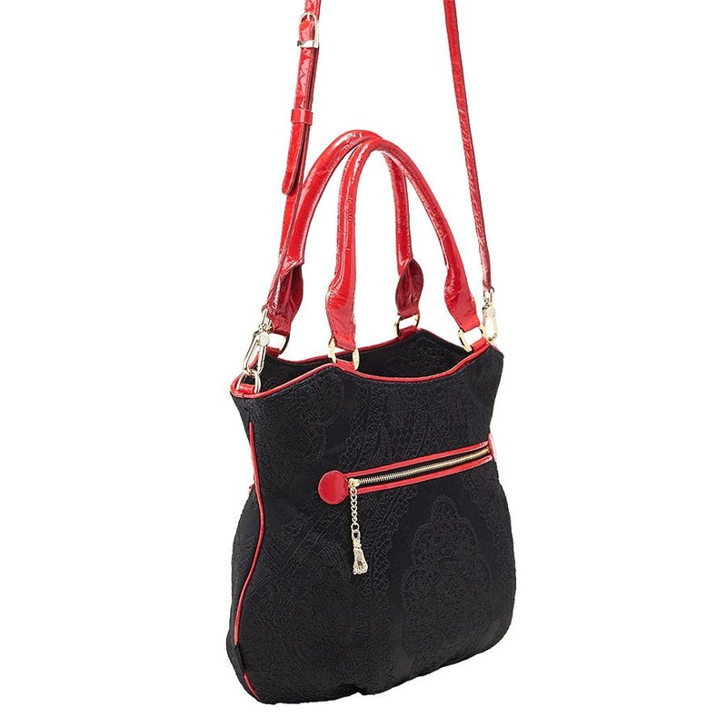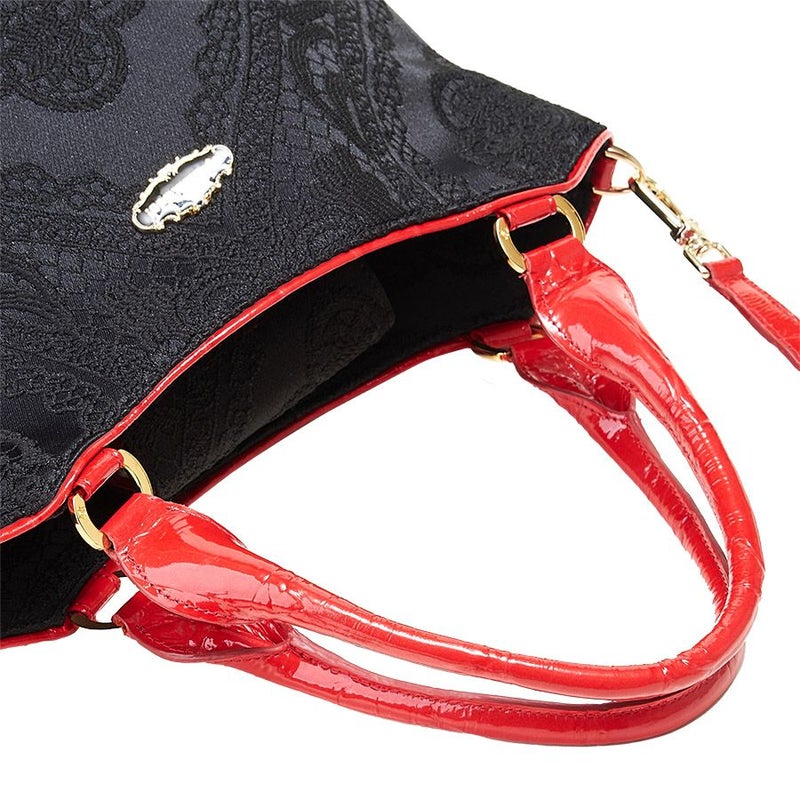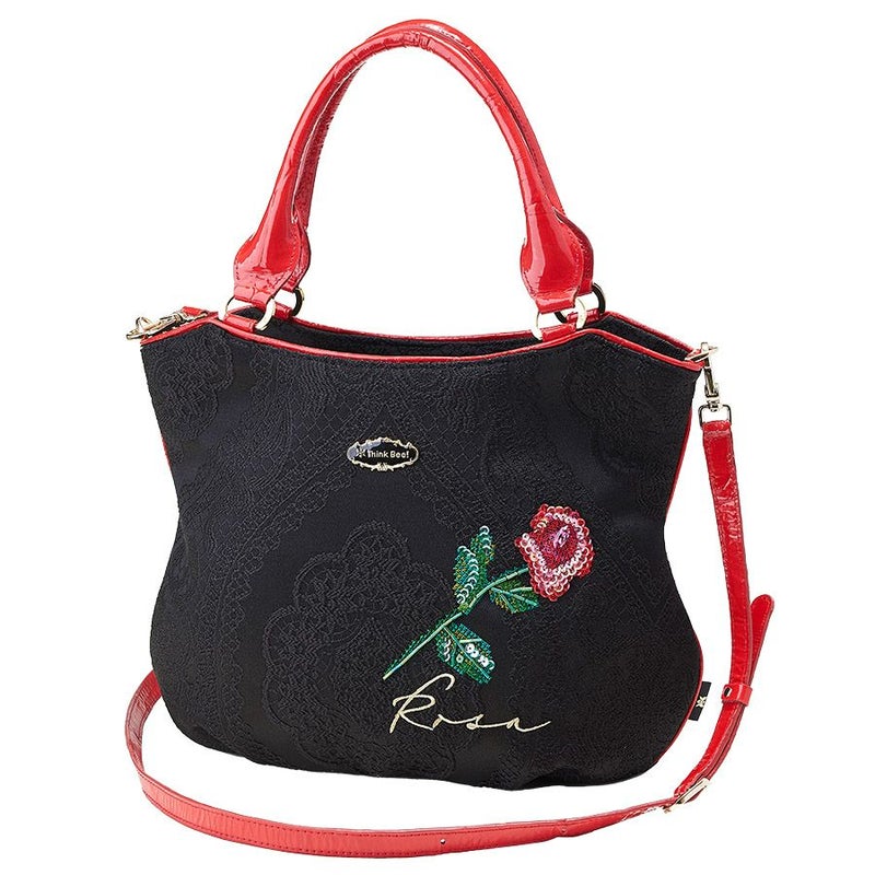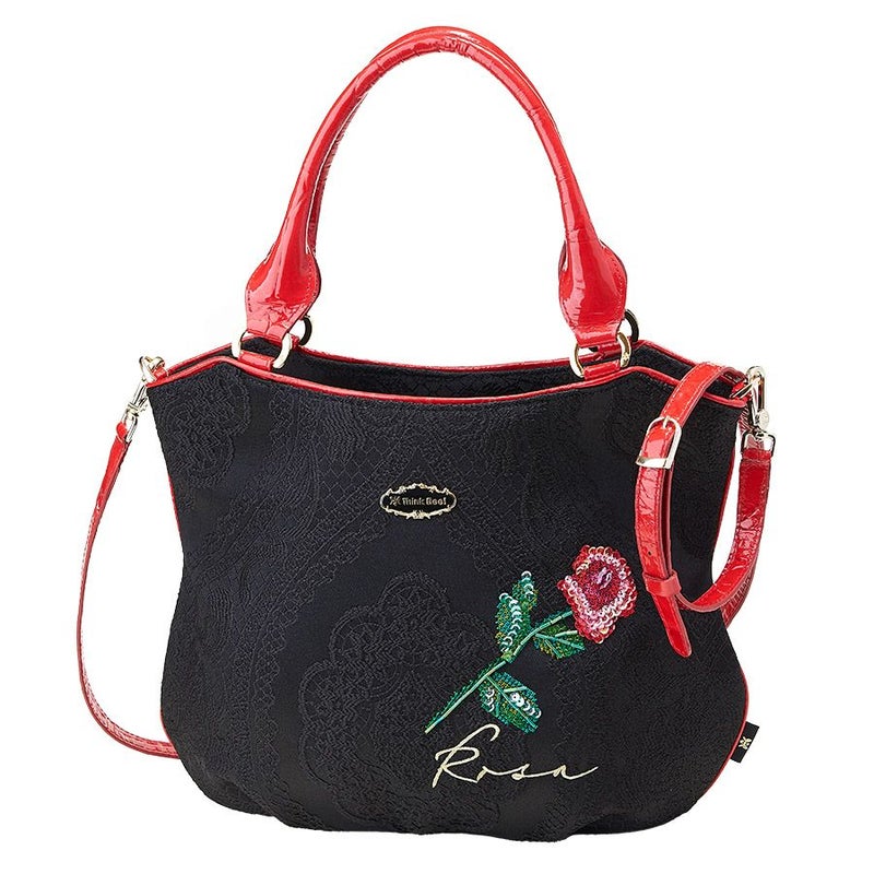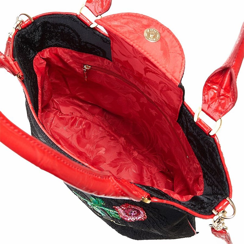裏地はローズやハンドルなどに合わせて華やかなレッドの花柄ジャカード織生地でインパクト抜群。