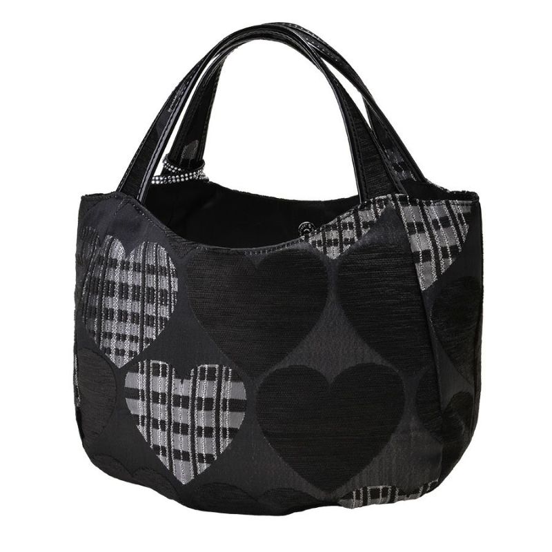 ほのかな光沢のあるブラック地に起毛したキーカラーやメタリックチェックのハートが並んだトルコ製の織生地は、見る角度により色の濃淡など変化が楽しめます。