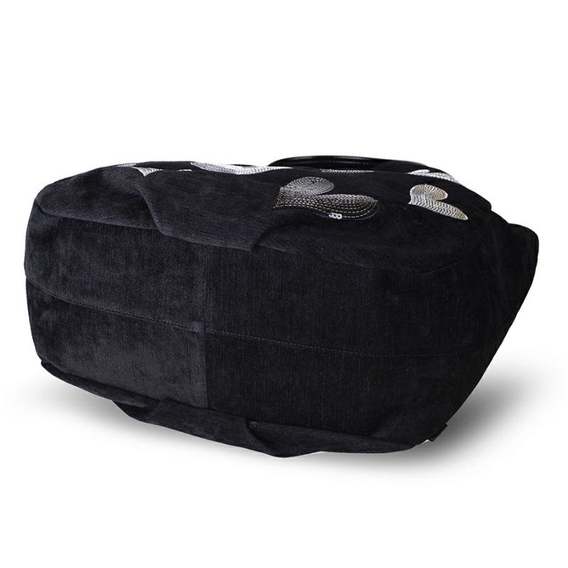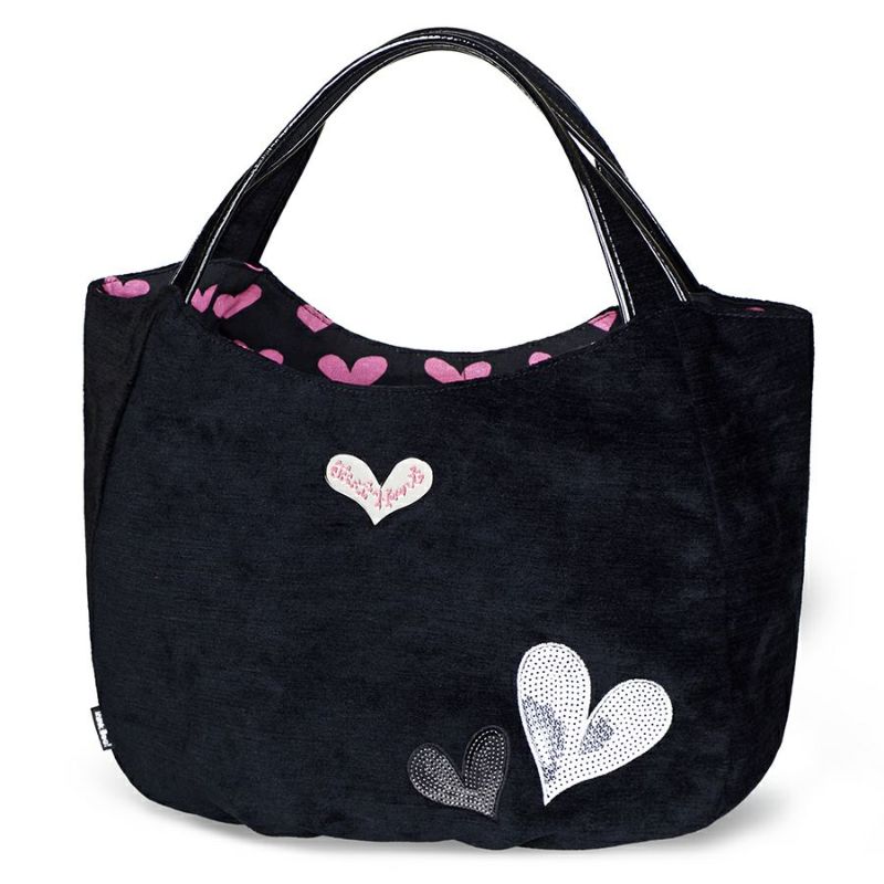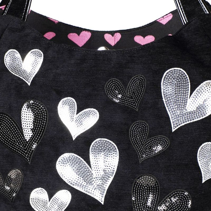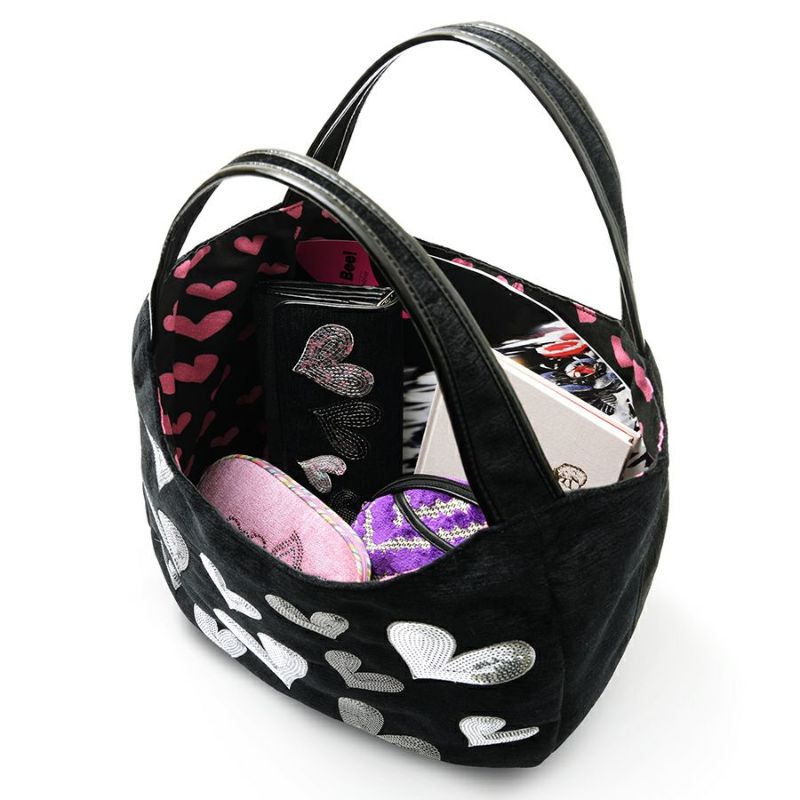 光沢のあるブラック地に、シルバーやブラックのスパンコールをハート型に敷き詰めて刺繍した、シンプルながらもインンパクトのあるシリーズ。