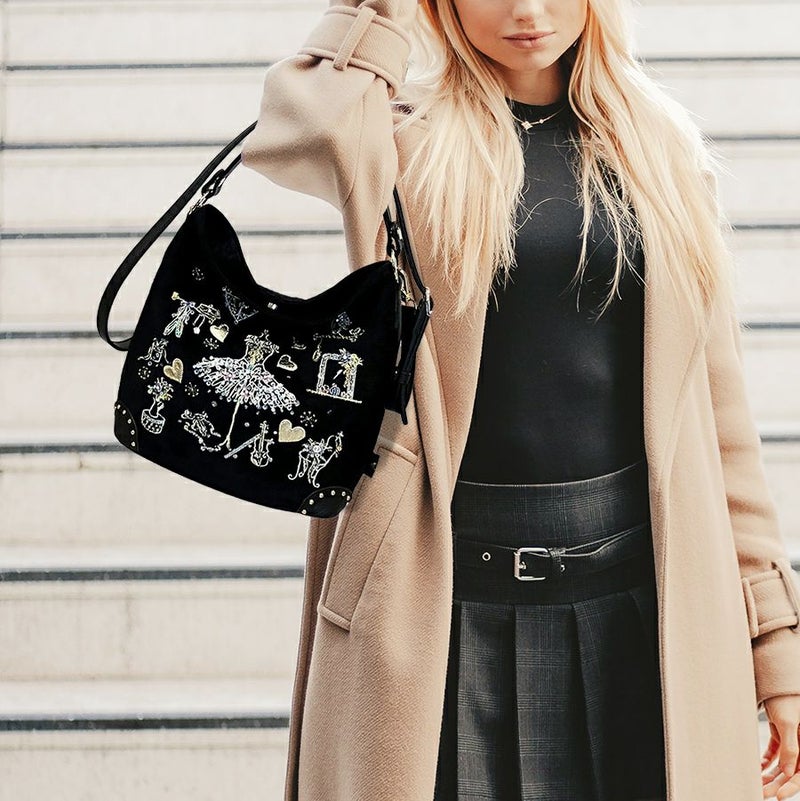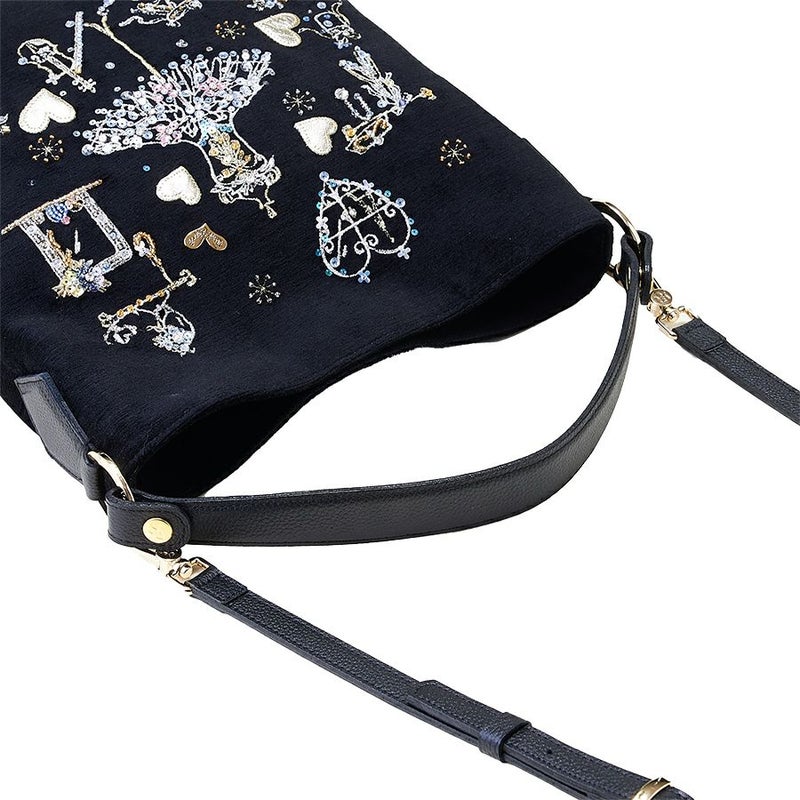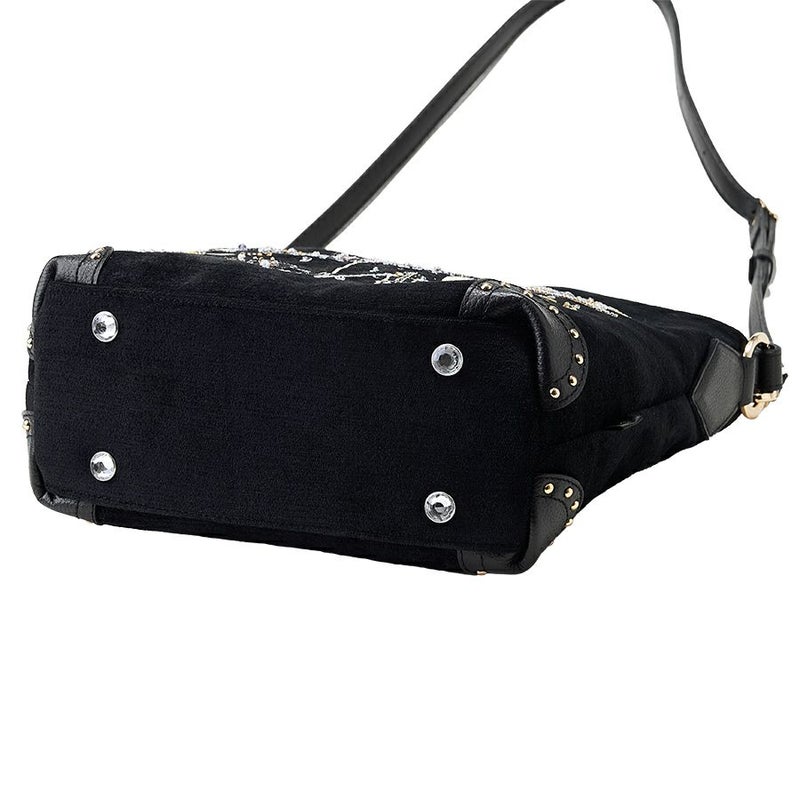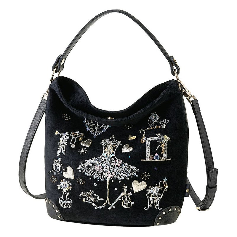 手触りの良いトルコ製の漆黒生地にプリンセスの弾む心の内をそのまま刺繍で表現したようなモチーフをビーズやスパンコール、クリスタルガラスなど、バランスよく散りばめて輝きを添えました。