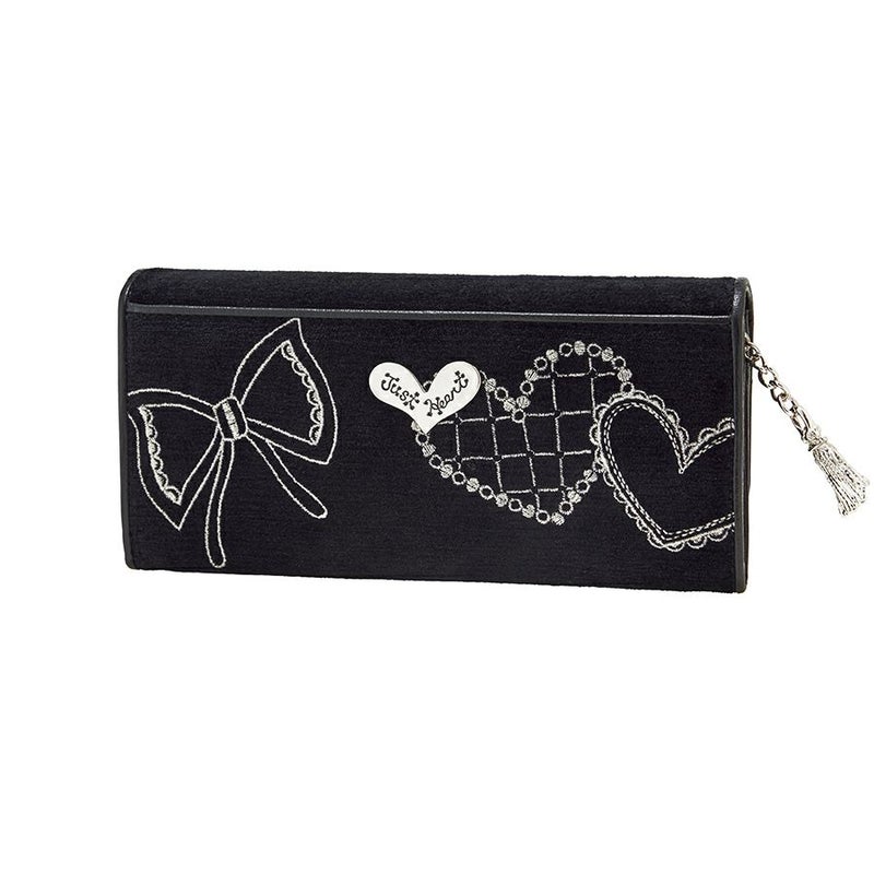 なめらかな手触りと深みのある黒が印象的な織生地に、リボンやハートモチーフをミシン刺繍で描きました。