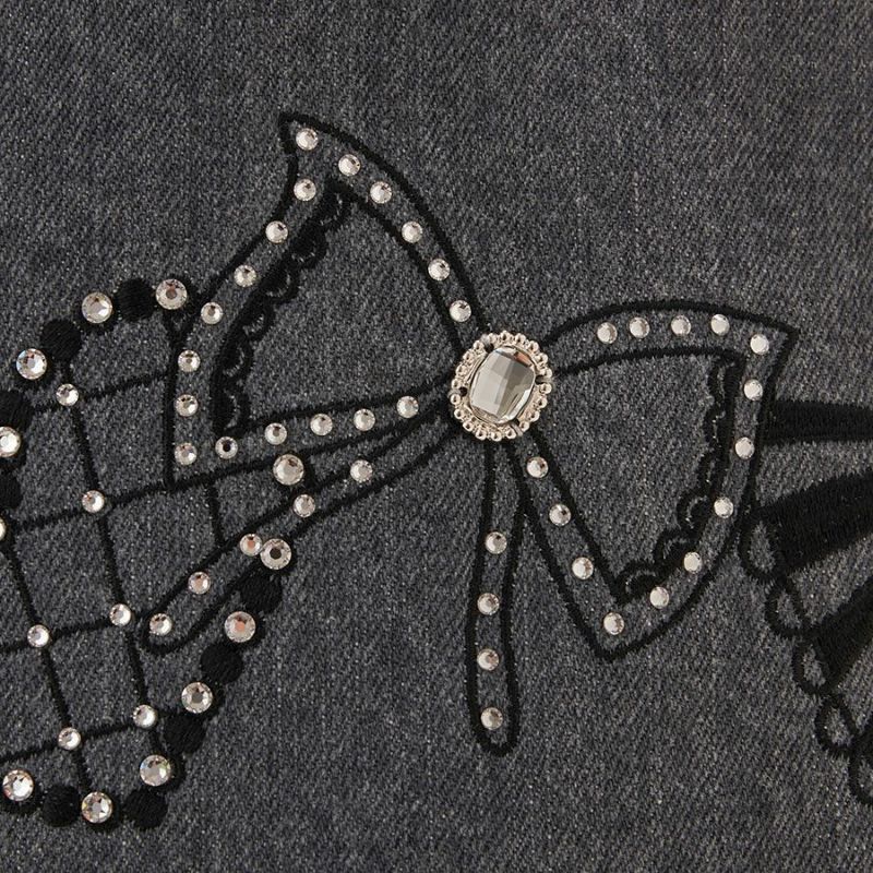 ウォッシュ加工をしたグレーのデニムに、リボンやハートモチーフをミシン刺繍で描きました。