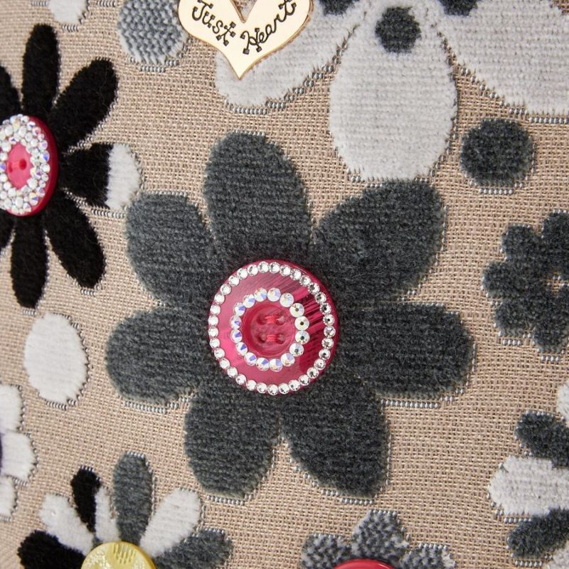 表地はパイルを凹凸に織り込んで柄を表現しているベルギー製の織物で、ふわふわとした手触りが特長。ダークベージュ地にモノトーンでシックに表現されたマーガレットの中心に配したのは、オリジナルで染め上げた11色のキュートなボタン。