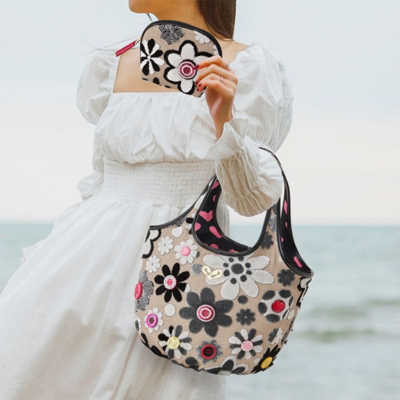 お揃いのポーチは大きく開くファスナー式。コスメや小物をマルチに収納できる、ほどよいサイズ感でお出掛けに便利です。