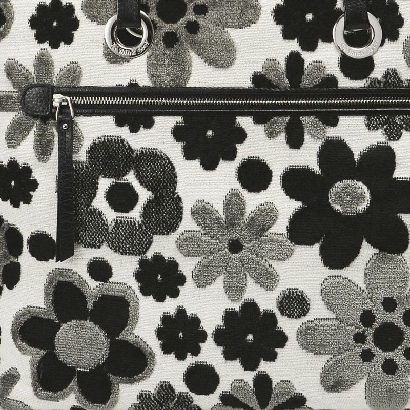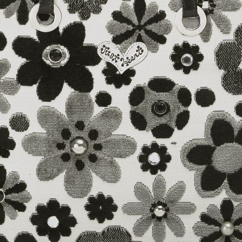 表地はパイルを凹凸に織り込んで柄を表現しているベルギー製の織物で、ふわふわとした手触りが特長。モノトーンで織り出されたマーガレットの中心に、ラインストーンやスタッズをあしらってさりげないアクセントに。