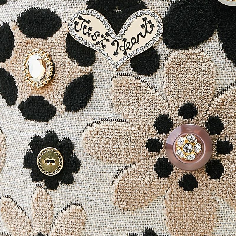 花々のセンターには、花芯に見立てたボタンやクリスタルガラス、ラインストーンがキラリ。
