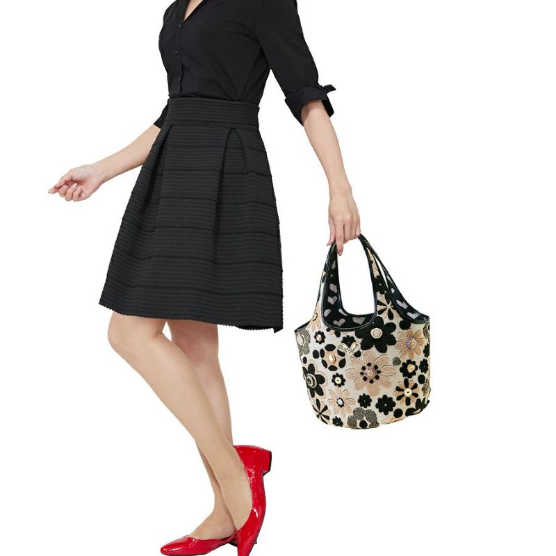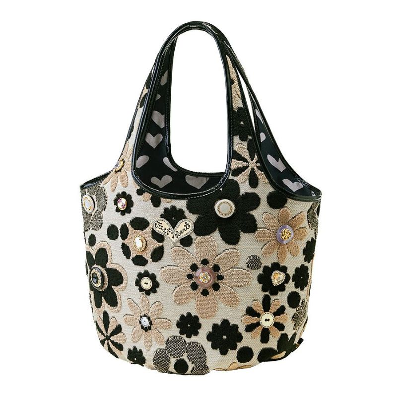 手持ちでも肩から掛けてもちょうど良い長さの一体型のハンドルで、甘すぎないカラーと装飾はファッションにも合わせやすく、キュートな印象を演出してくれる大人が持ちやすいバッグです。