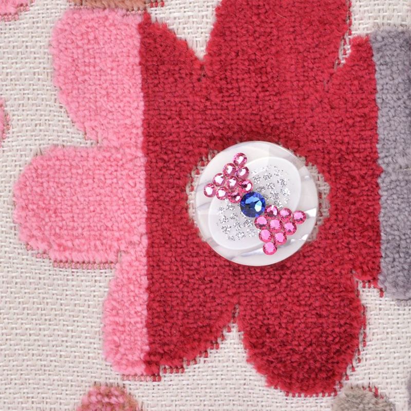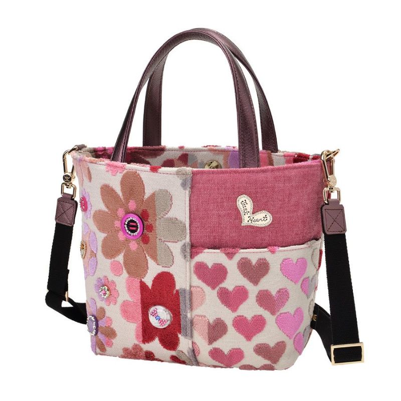 ボディに使用したのはベルギー製の織生地。ピンク系にパープルとライトグレーが混じり合う表情豊かなマーガレットとハート柄生地は、パイルを凹凸に織り込んで柄を表現したふわふわと柔らかい質感が特徴です。この可愛いコンビネーションに、印象の引き締め効果として無地を合わせました。