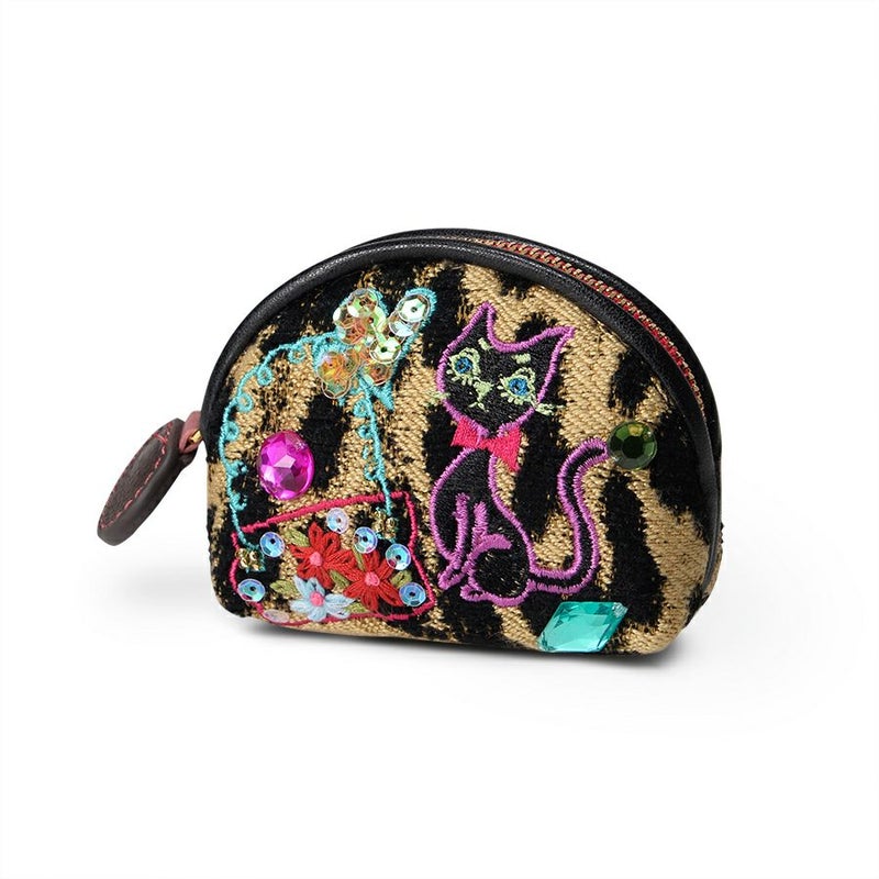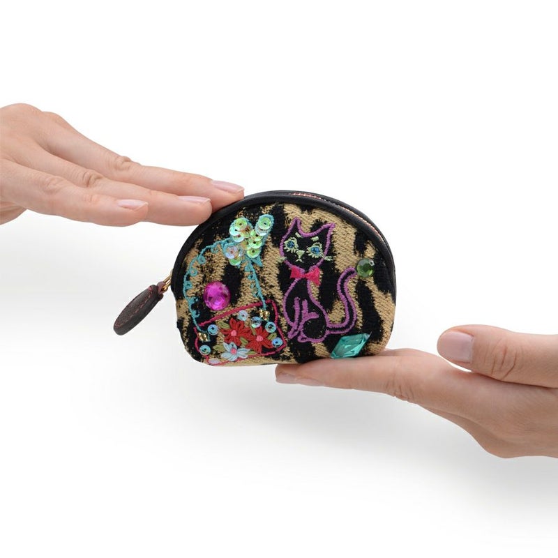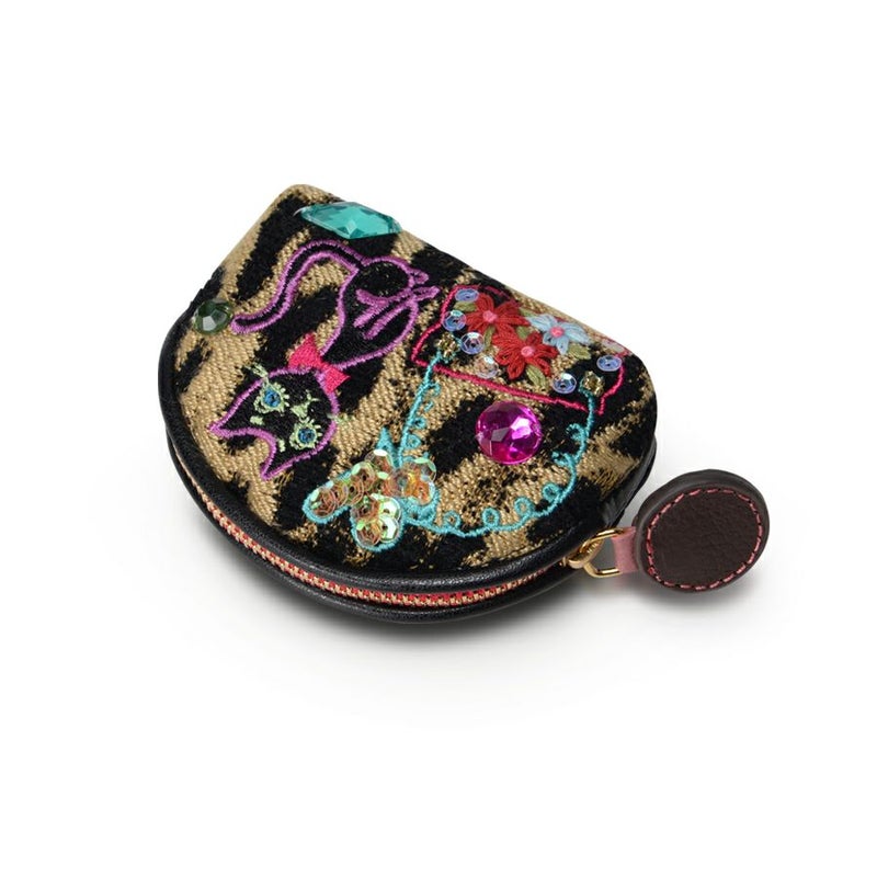 イタリア製レオパード柄のジャカード織生地にネコやバッグなど女性の大好きなものを刺繍で表現。
