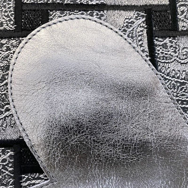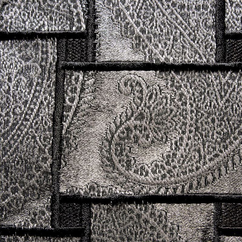 ボディの上品な光沢を放つペーズリー模様は、シルバーとブラックの糸で立体的に表現された繊細で美しい織生地。その上に黒糸で直線的な刺繍を二次加工で施すことで生地の印象ががらりと変わり、幅広のリボンを編み込んだような独創的なデザインに。