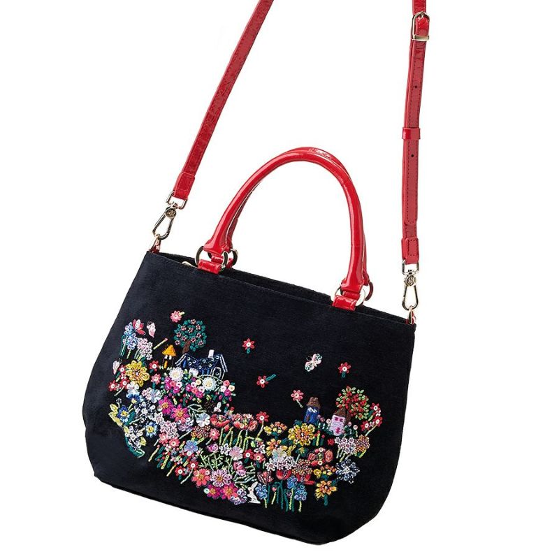 ハンドルとショルダーストラップは、刺繍に合わせたレッドのエナメル加工を施した艶やかな型押しレザーで、エスプリを効かせて。