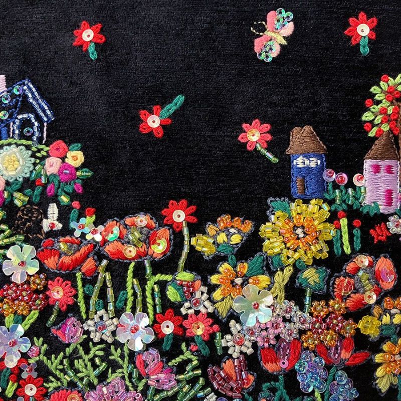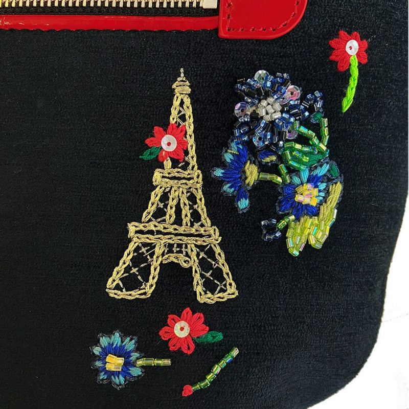 背面にはフランスのシンボル、エッフェル塔と色とりどりの花々を。お花に囲まれたエッフェル塔は手刺繍ならではのあたたかみがあり、まるで物語のワンシーンのよう。