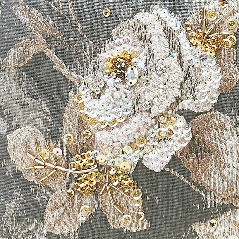 生地の表面にエアリーなふっくら感があり、手触りの良さが特徴です。透明色や乳白色を中心に、七色に輝くビーズ・スパンコールが複雑に反射し合い、柄をより立体的に見せます。