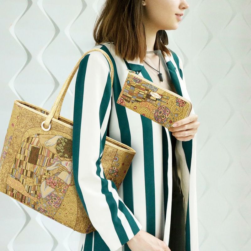 日本美術の影響を受けたともいわれるクリムト絵画の華麗な装飾部分を再現した織物は、ヨーロッパ的な絢爛美の中にどこか親しみを感じるデザインです。