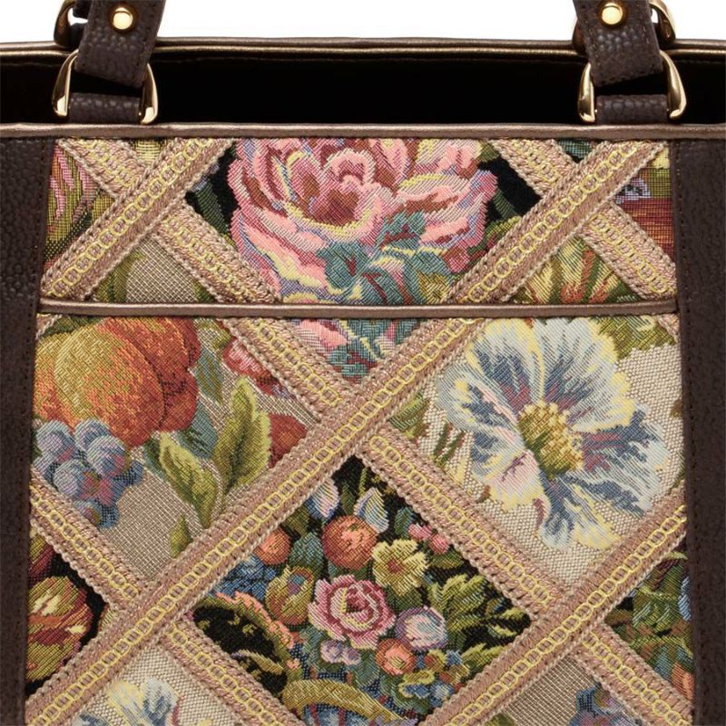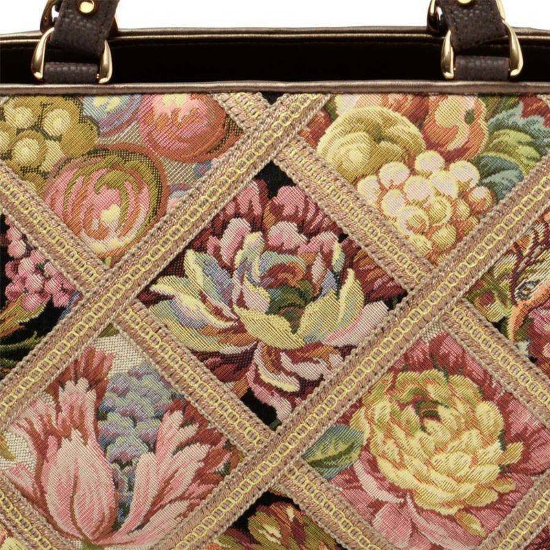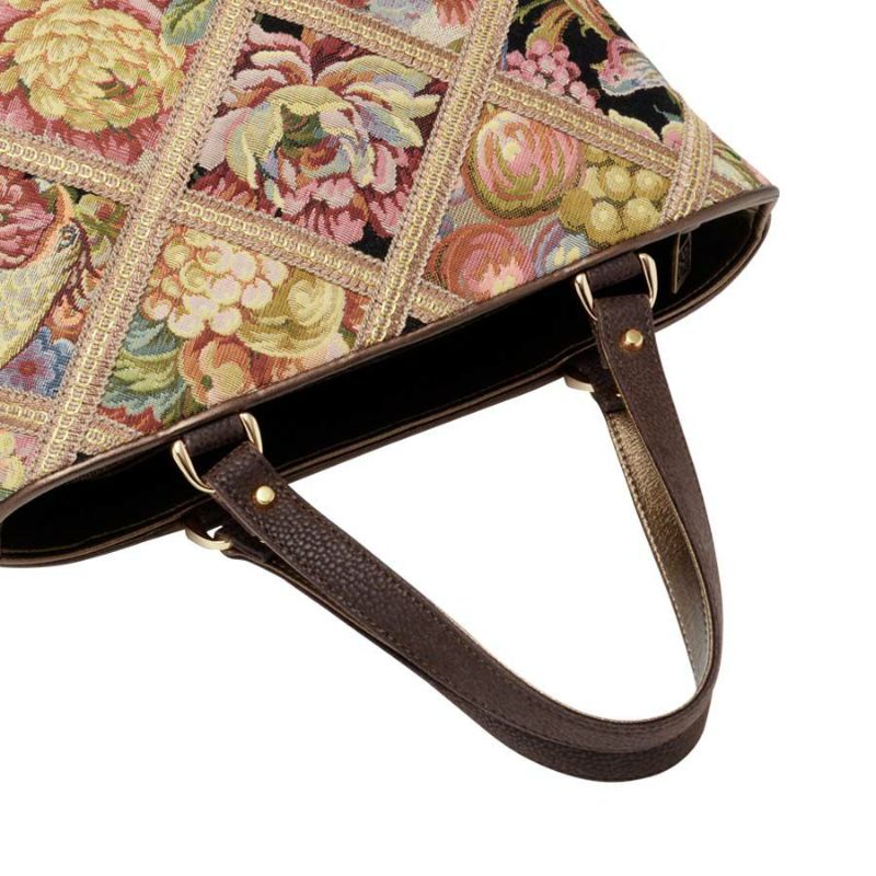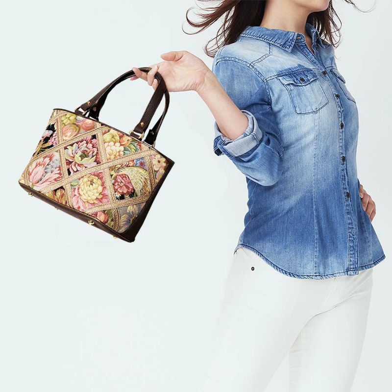 | 素材 | | 表地原産国 | イタリア | | 表地 | ビスコース70%・アクリル21%・ポリエステル7%・ナイロン2% | | 裏地 | ポリエステル100% | | ハンドル | 合成皮革 | | その他 | - | | サイズ(約) | | 本体(突起部を除く最大) | H 17.5 × W 29 × D 15 cm | | ハンドル立ち上がり | 15 cm/- | | ショルダーストラップ長さ | -/- | | 重さ | 400g | | | 仕様 | | 開口部 | オープン式 | | メイン室 | 2 /中仕切りファスナーポケット×1 | | 内側 | ファスナー付ポケット×1・オープンポケット×2(内携帯電話サイズ×1) | | 外側 | オープンポケット×1 | | ハンドル | 2 /- | | 底鋲 | 4 | | その他 | 作品により柄の出方が異なる場合があります | | 補足情報 | | - | |