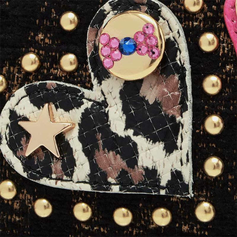 レオパード柄のレザーハートには、クリスタルガラスで飾ったボタンと星形スタッズがキラリ。