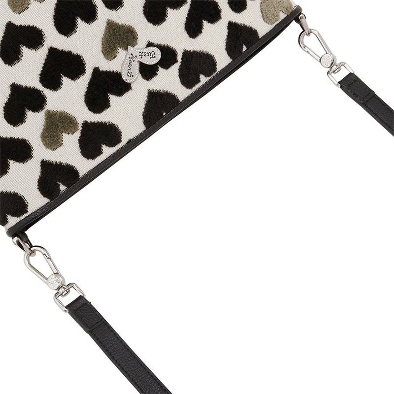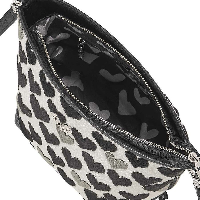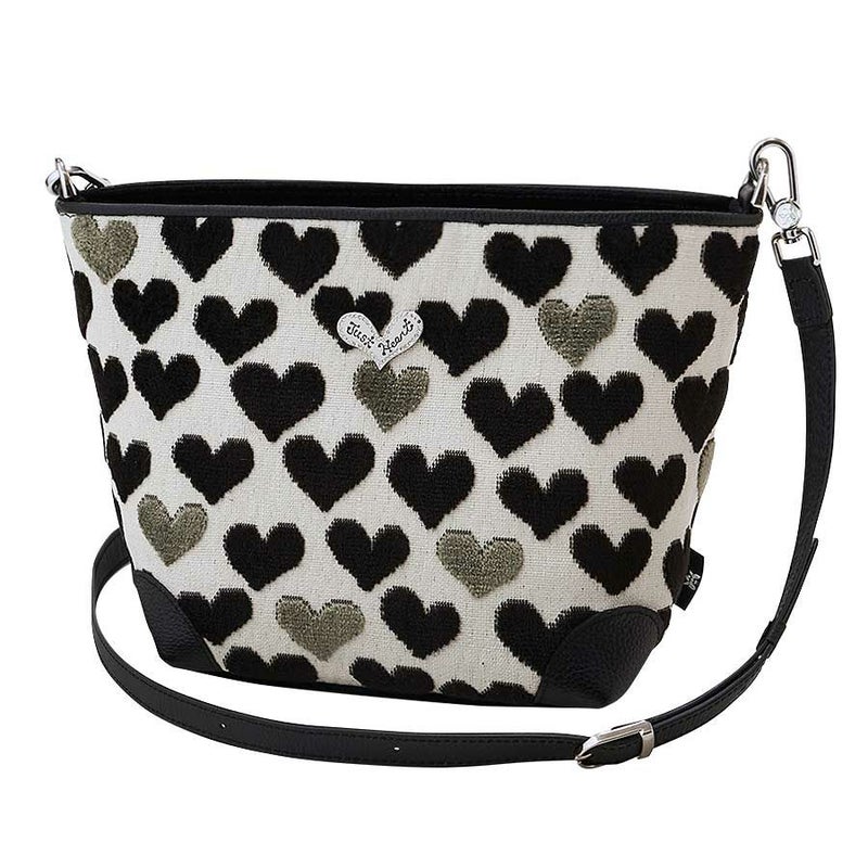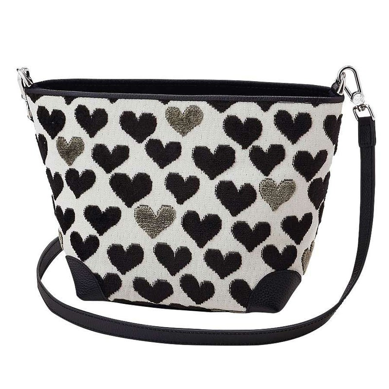 内側には細々したものの整理がしやすい、ファスナー付ポケットが1つ、オープンポケットが2つ付いて、裏地にもハートのプリント生地を配したハートづくしの愛らしいバッグです。