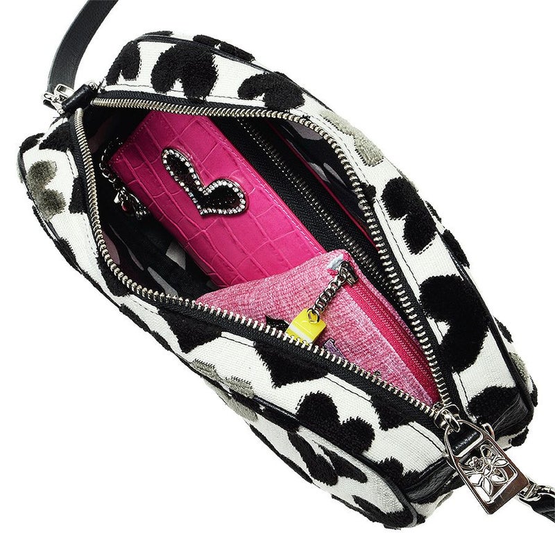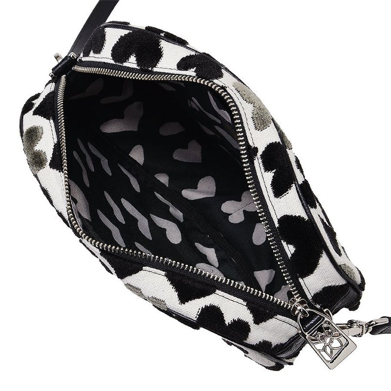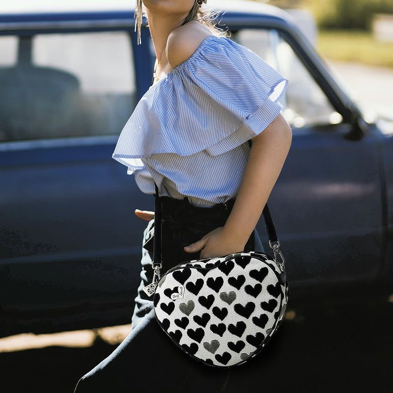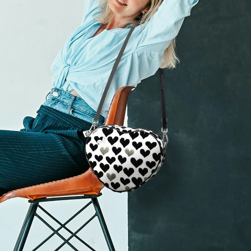 表地カラーに合わせてショルダーストラップやパイピングは、ブラックのシュリンクレザーで印象を引き締め、ころんとしたハート型を際立たせています。