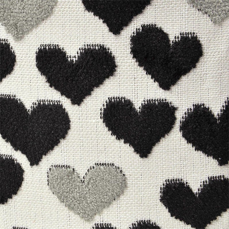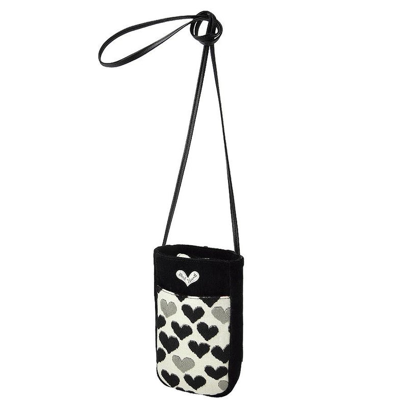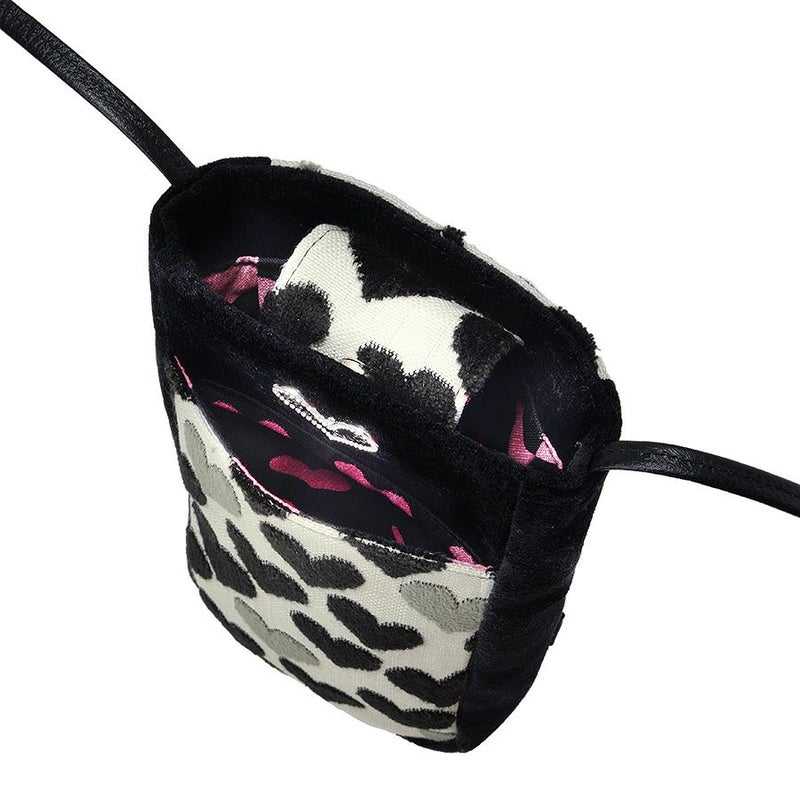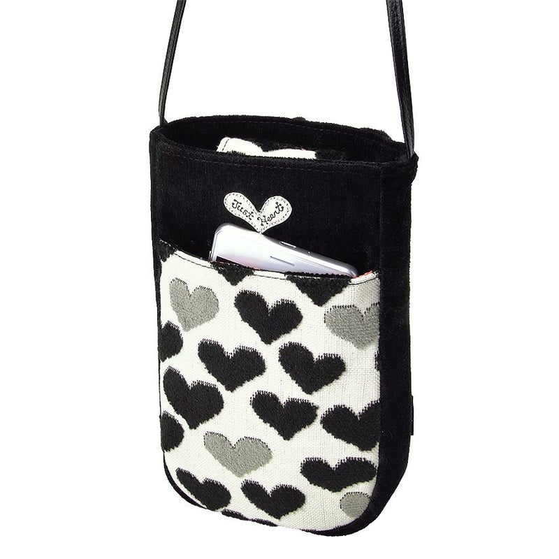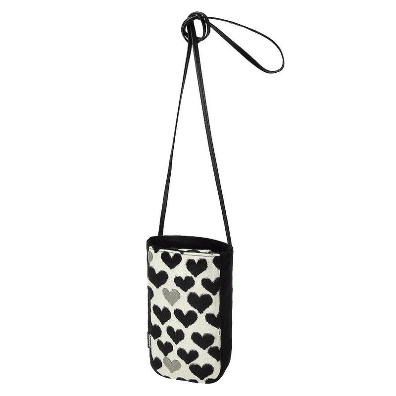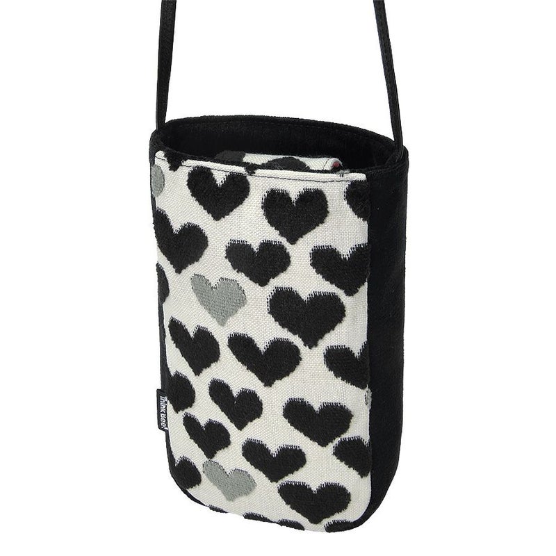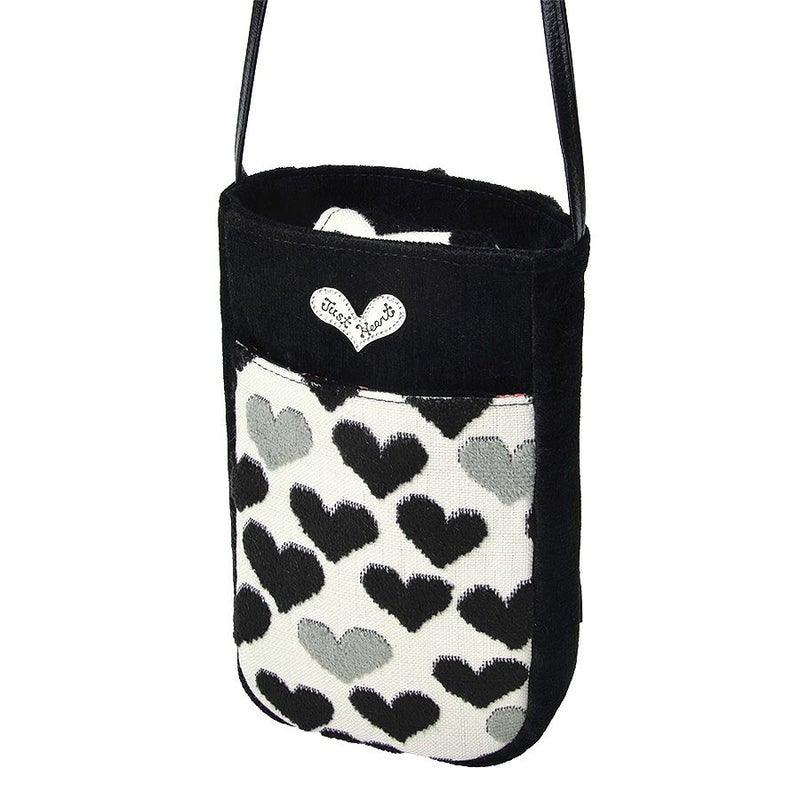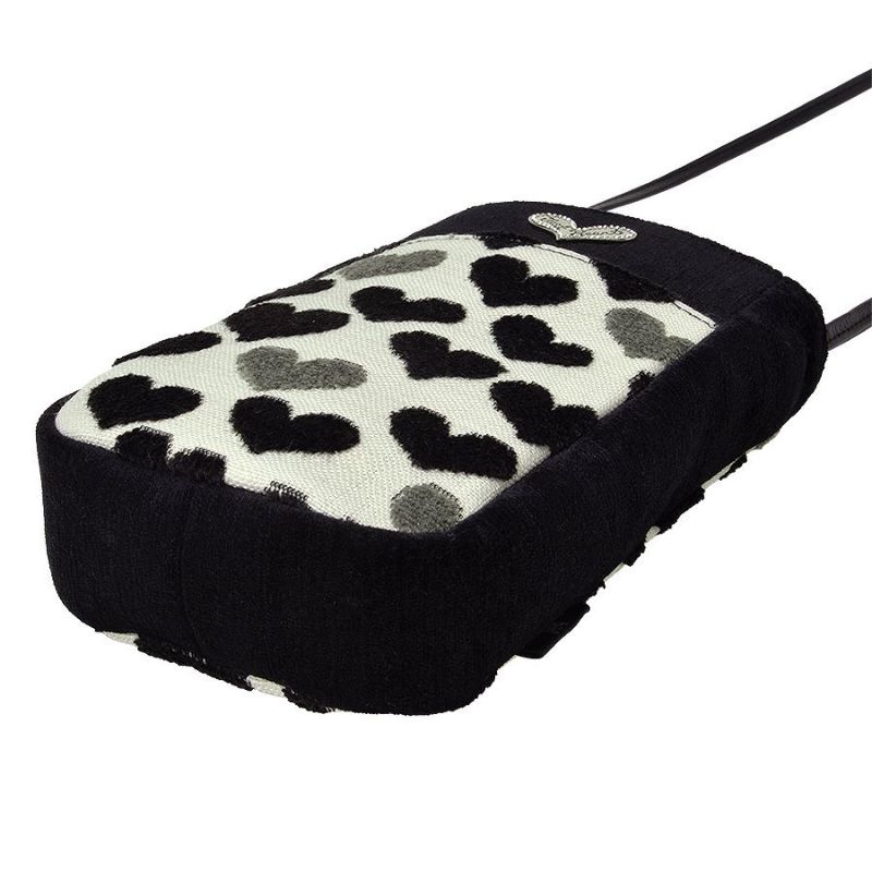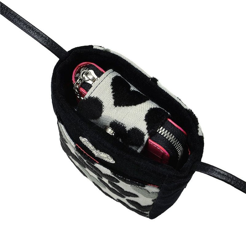 ベルギー製のふわふわとした手触りが特長のモノトーンで織り出されたハート柄生地と、ツヤ感のあるブラック生地とのコンビネーションで、可愛らしさを盛り込んだシックなポシェットです。
