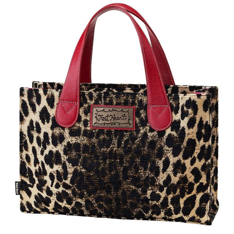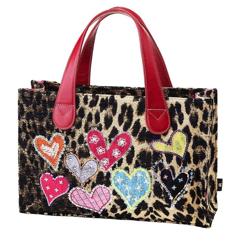イタリア製レオパード柄のジャカード織生地をベースに、装飾はカラフルでポップなハートをミシン刺繍であしらい、その上にスパンコールやクリスタルガラスで多彩な煌めきを散りばめて、華やぎと可愛さUP。