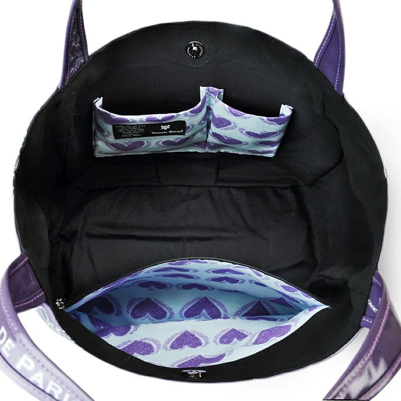 前面内側ポケットはブラック生地に映えるライトブルー地にラベンダーのハート生地でポップに。
