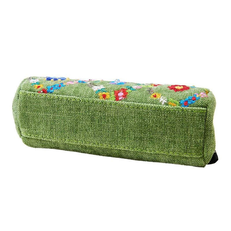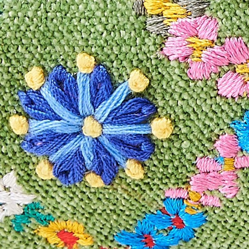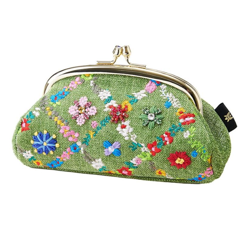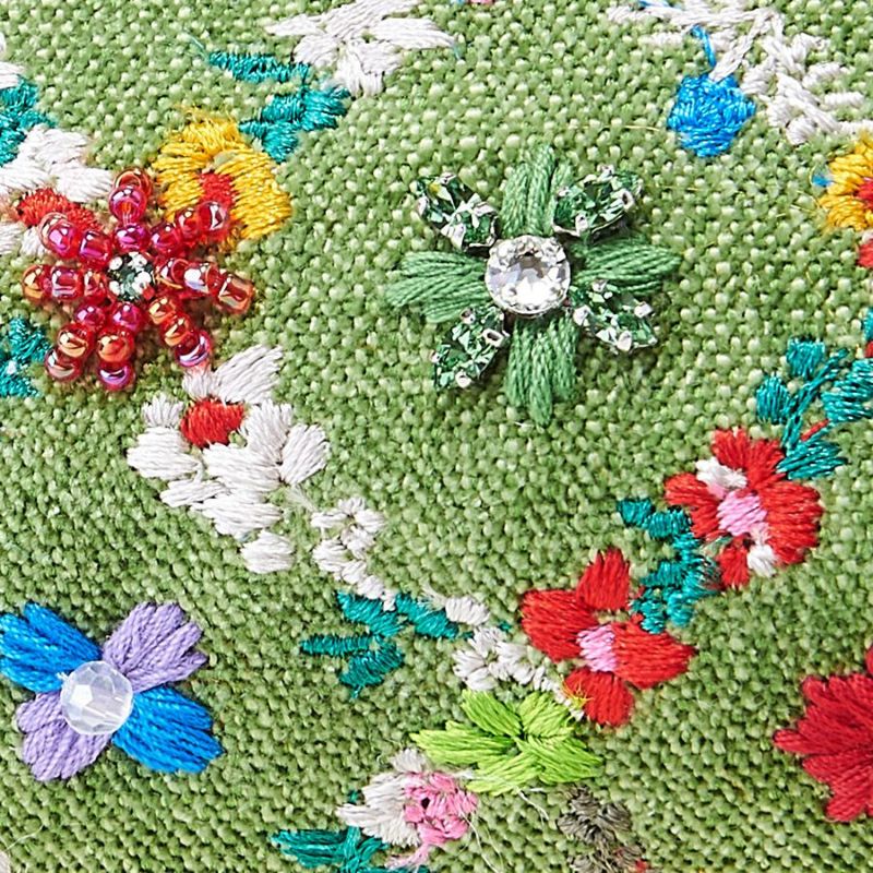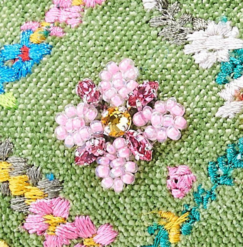 グリーンのイタリア製生地に、格子状に連なる花々はミシン刺繍。格子の間に咲く花たちは、スワトウ工房の職人が丁寧に手刺繍で仕上げました。爪付きのスワロフスキー・クリスタルやビーズがちりばめられ、キラキラと煌きを放ちます。