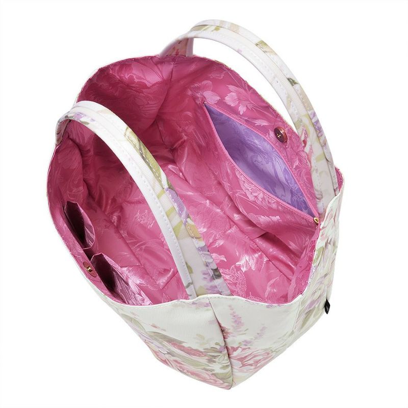 花柄ジャカード織生地を使用した裏地のローズピンクが、バッグを持った時にちらりと見て品よく華やか。