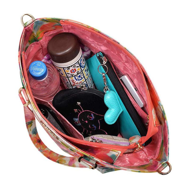 そして、マチ幅(13.5cm)もしっかりとあるため、マグボトルやポーチ、長財布などもすっきりと収まりデイリー使いにぴったり。