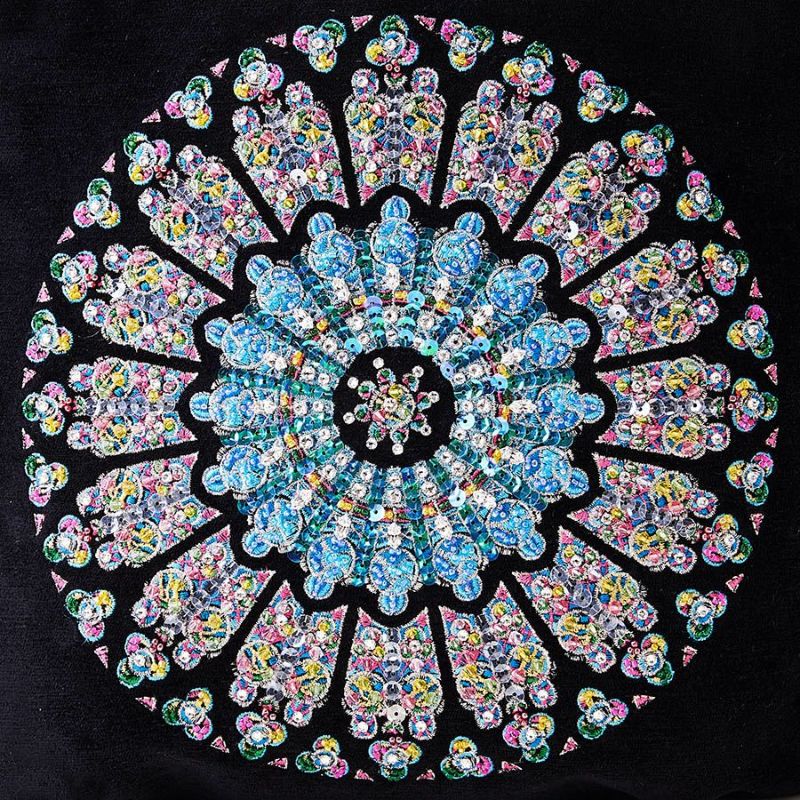 薔薇窓を様々な角度から写真撮影するところから、色彩を忠実に割り出して再現性にこだわり、世界最高峰の技術を誇る、中国・スワトウの技術と職人が丹精をこめて手刺繍を施しました。