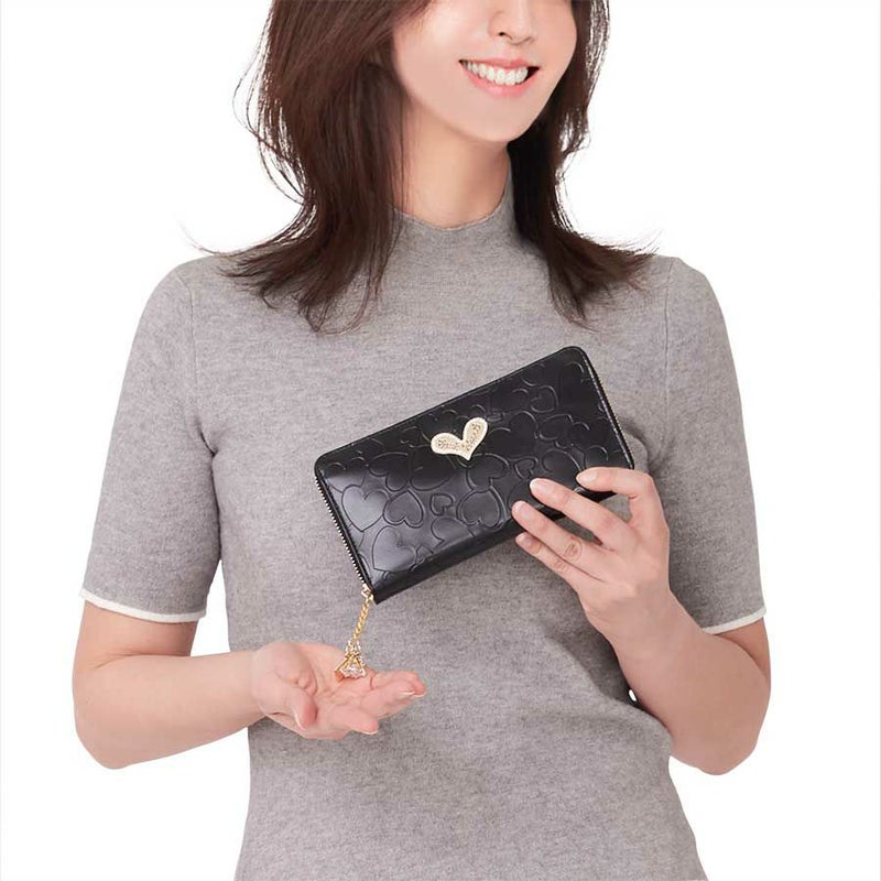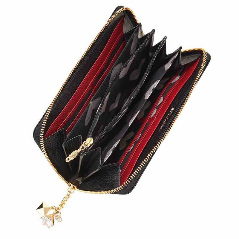 引手は大ぶりのジルコニアと小粒のクリスタルガラスがキラキラ揺れるチェーンタイプ。長めのチェーンが持ちやすく、開閉しやすくなっています。ブラックレザーと相性抜群のゴールドが、より一層高級感を演出しています。