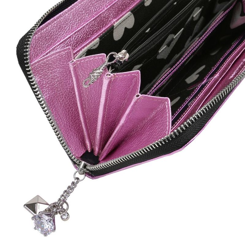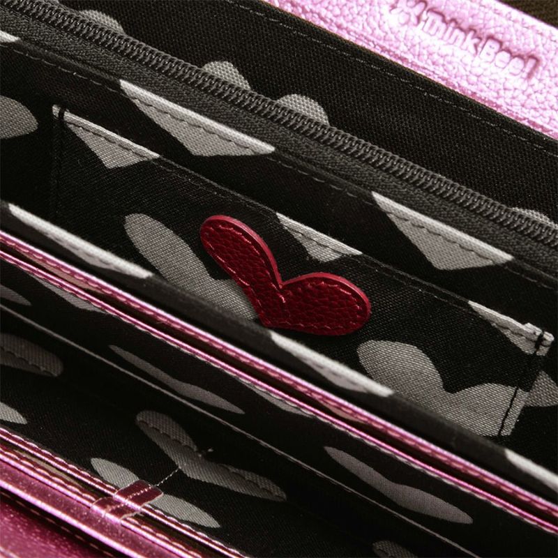 ラウンドファスナーを開けると、内装もピンクのメタリックなシャイニー感でぱっと華やか。細かなシボが特徴のシュリンクレザーは独特の風合いがあり、傷が目立ちにくいのも嬉しいポイント。