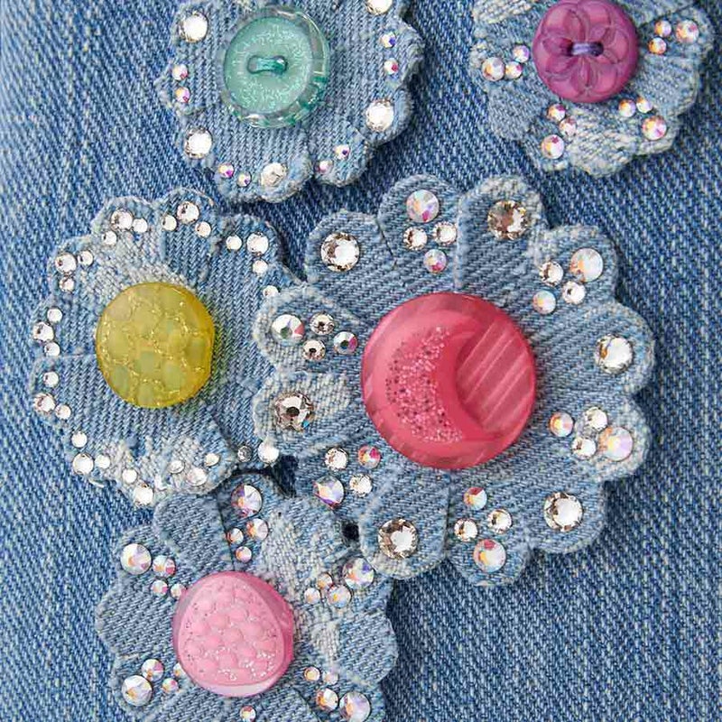 フラワーモチーフにはロゴマークの蜂を織り込んだオリジナルデニムをベースに、カラフルなオリジナルボタンを花芯に見立て、一輪一輪異なるデザインのデニムフラワーを咲かせました。