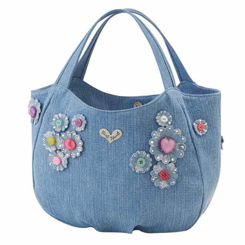 裏地はブルー地にパープルのハートプリント生地で爽やかに、デニムと相性も抜群!
