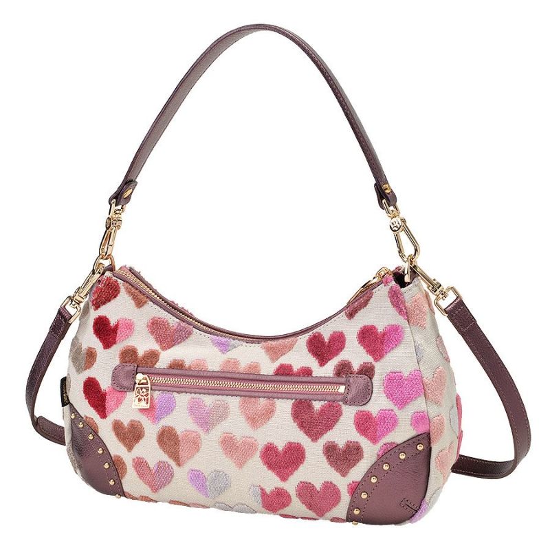 ボディに使用したのはベルギー製の織生地。ピンク系にパープルとライトグレーが混じり合う表情豊かなハート柄生地は、パイルを凹凸に織り込んで柄を表現したふわふわと柔らかい質感が特徴です。