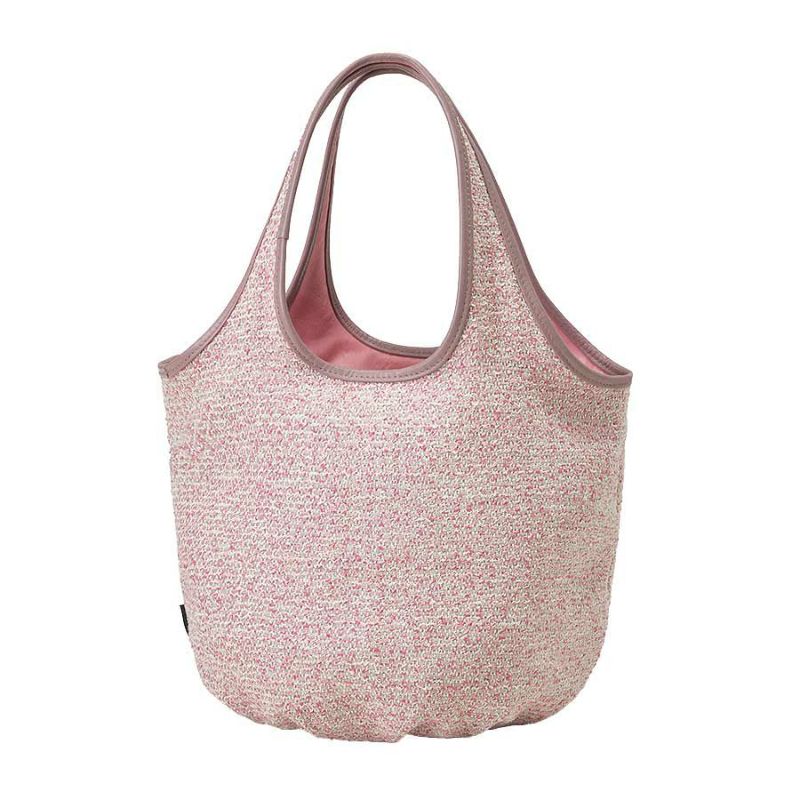 ハンドルは本体と一体型の共生地で、柔らかさと軽さを重視。くすみピンクのスムースレザーで縁取って、品良く手馴染みのよい仕上がりに。