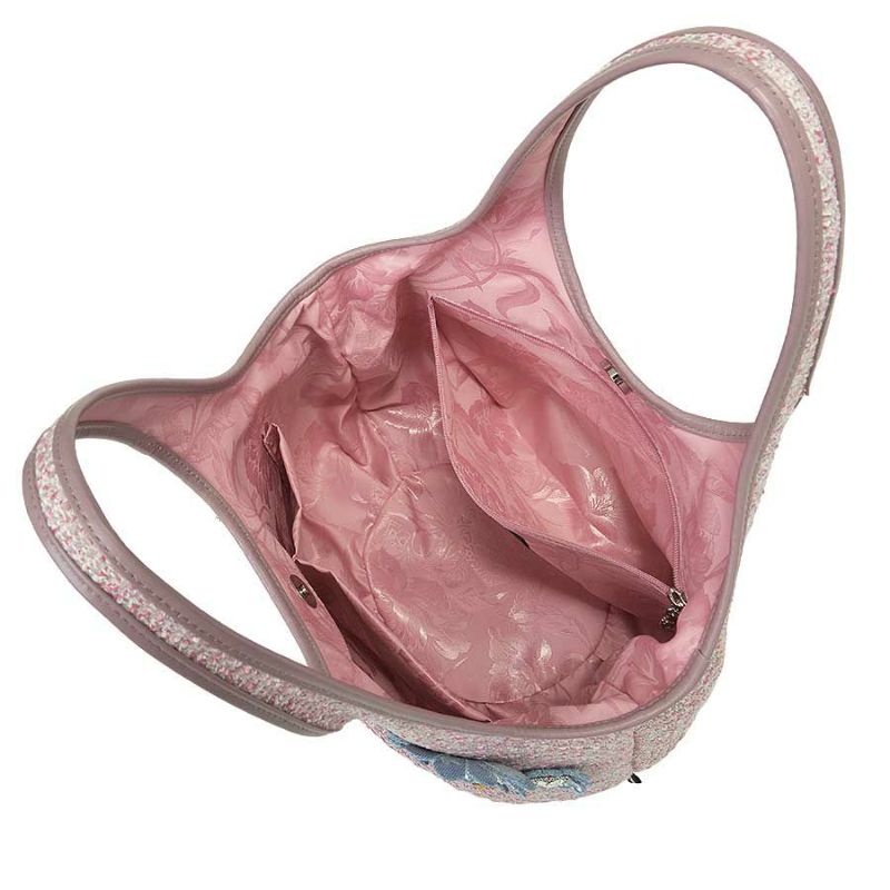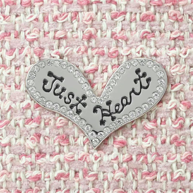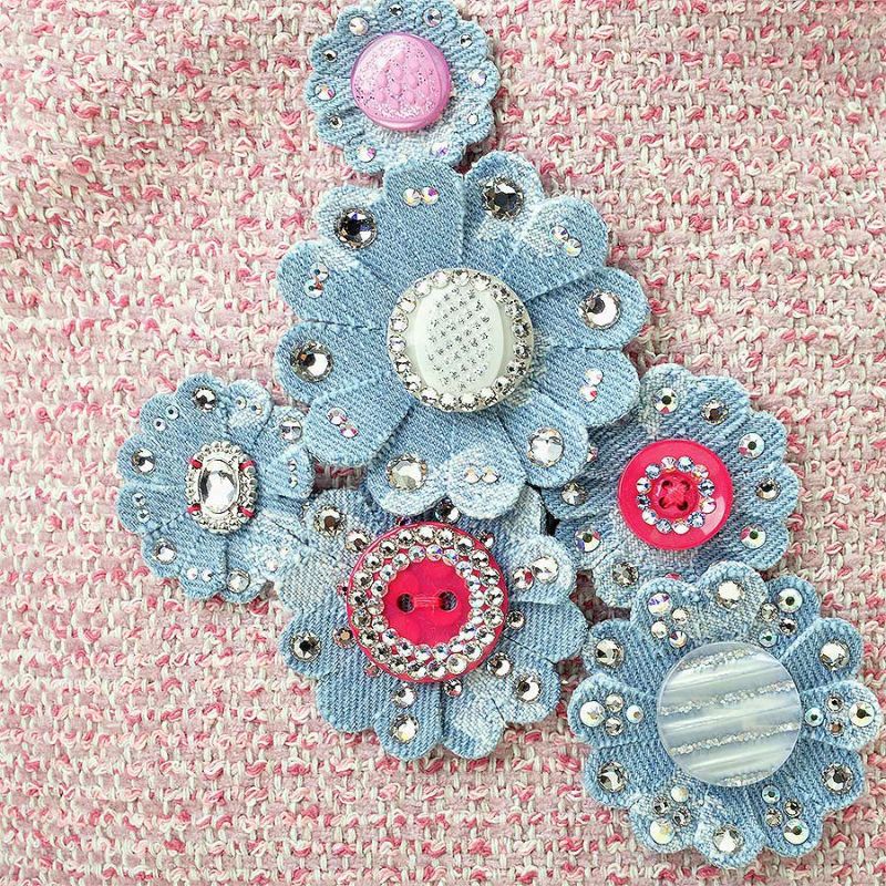 ピンク系を織り交ぜたツイード生地に合わせたのは、オリジナルデニムをベースに、煌めくオリジナルボタンを花芯に見立て、花びらにも贅沢にクリスタルガラスを散りばめたフラワーモチーフ。