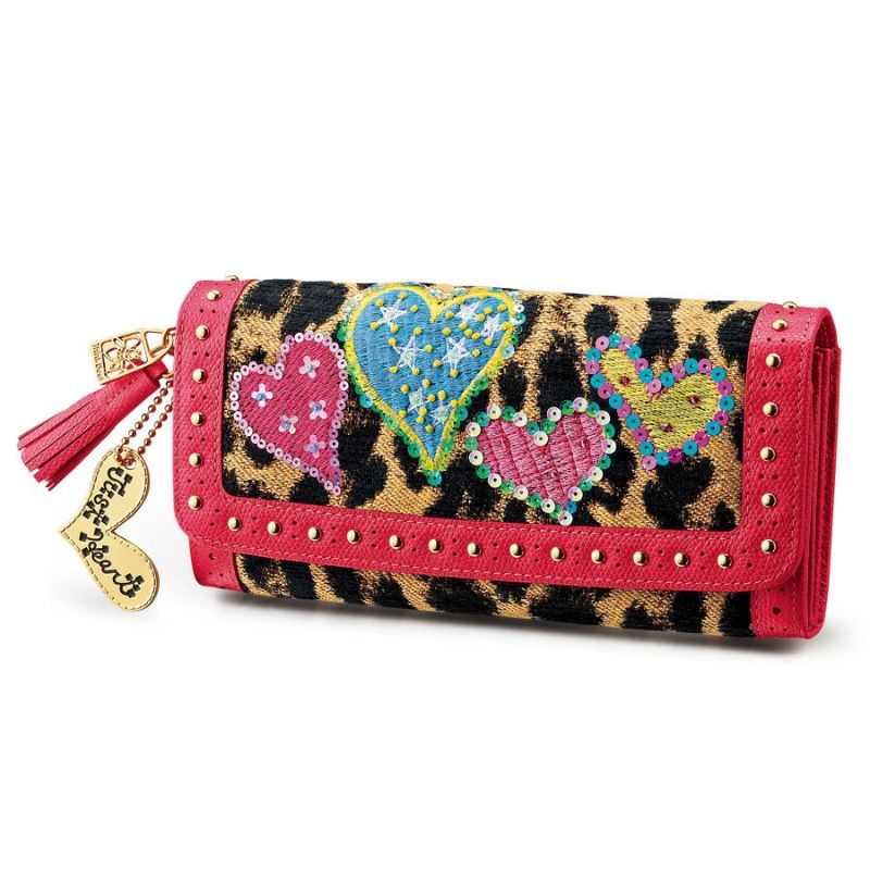 イタリア製レオパード柄のジャカード織生地をベースに、装飾はカラフルでポップなハートをミシン刺繍であしらい、その上にスパンコールやスワロフスキー・クリスタルで多彩な煌めきを散りばめて、華やぎと可愛さUP。