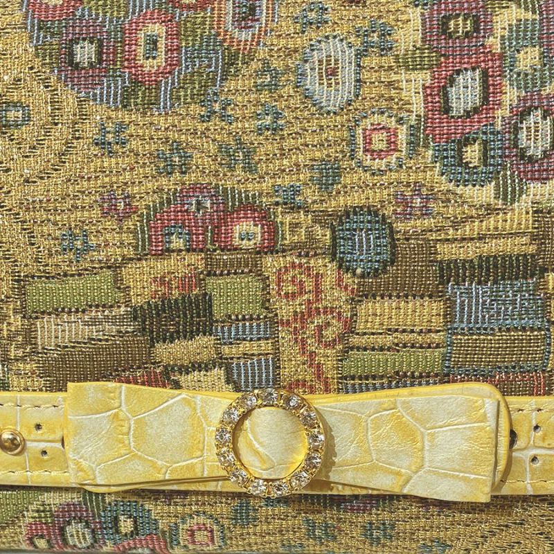 表地はイタリア製でゴールドを基調に緻密に織り上げられた幾何学模様は、19世紀末オーストリアの画家グスタフ・クリムトの絵画をもとに現代風にアレンジしたもの。