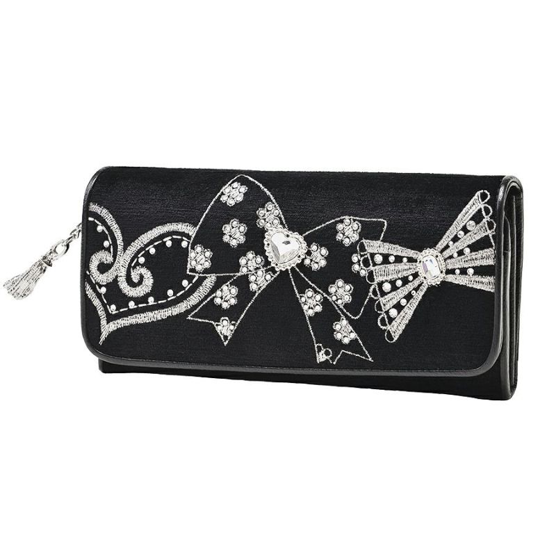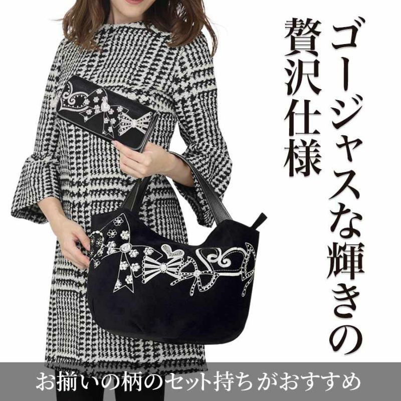 なめらかな手触りと深みのある黒が印象的な織生地に、リボンやハートモチーフをミシン刺繍で描きました。