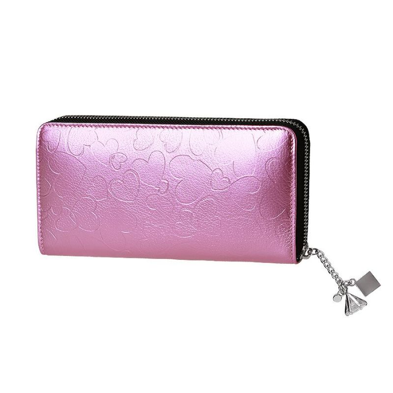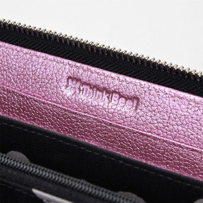 ラウンドファスナーを開けると、内装もピンクのメタリックなシャイニー感でぱっと華やか。細かなシボが特徴のシュリンクレザーは独特の風合いがあり、傷が目立ちにくいのも嬉しいポイント。