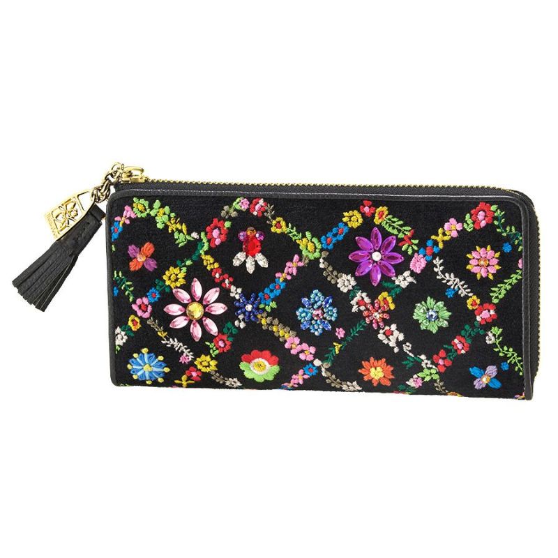 格子状に連なる花々はミシン刺繍。格子の間に咲く花たちは、スワトウ工房の職人が丁寧に手刺繍で仕上げました。爪付きのスワロフスキー・クリスタルをはじめビーズやスパンコール、ラインストーンがちりばめられ、キラキラと煌きを放ちます。
