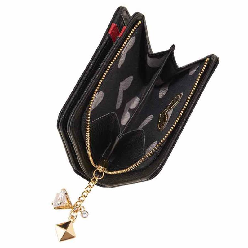 引手は大ぶりのジルコニアと小粒のクリスタルガラスがキラキラ揺れるチェーンタイプ。長めのチェーンが持ちやすく、開閉しやすくなっています。ブラックレザー×ゴールドのコンビネーションで、さらに高級感を演出しています。
