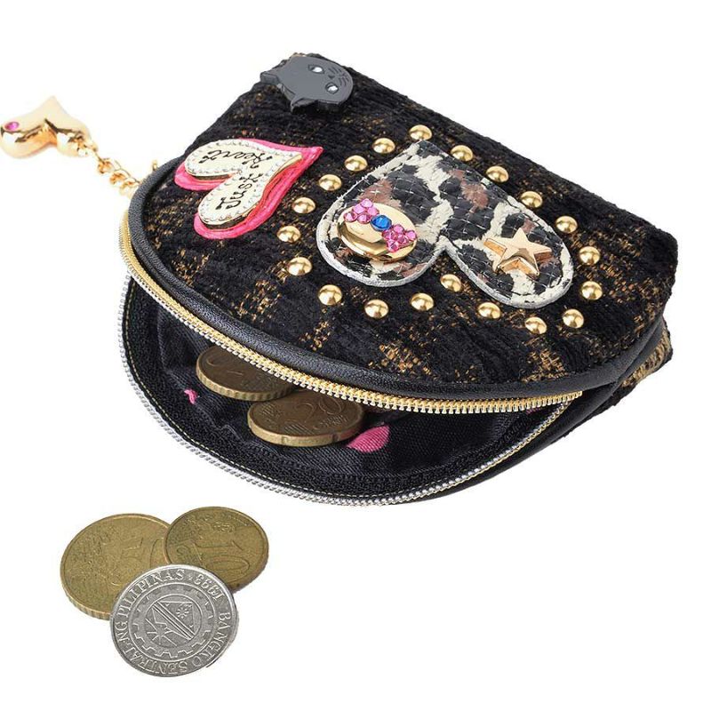 レオパード柄のレザーハートには、クリスタルガラスで飾ったボタンと星形スタッズがキラリ。