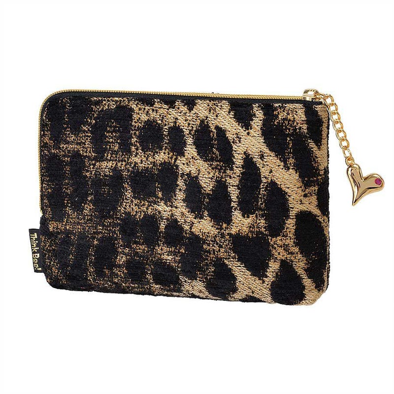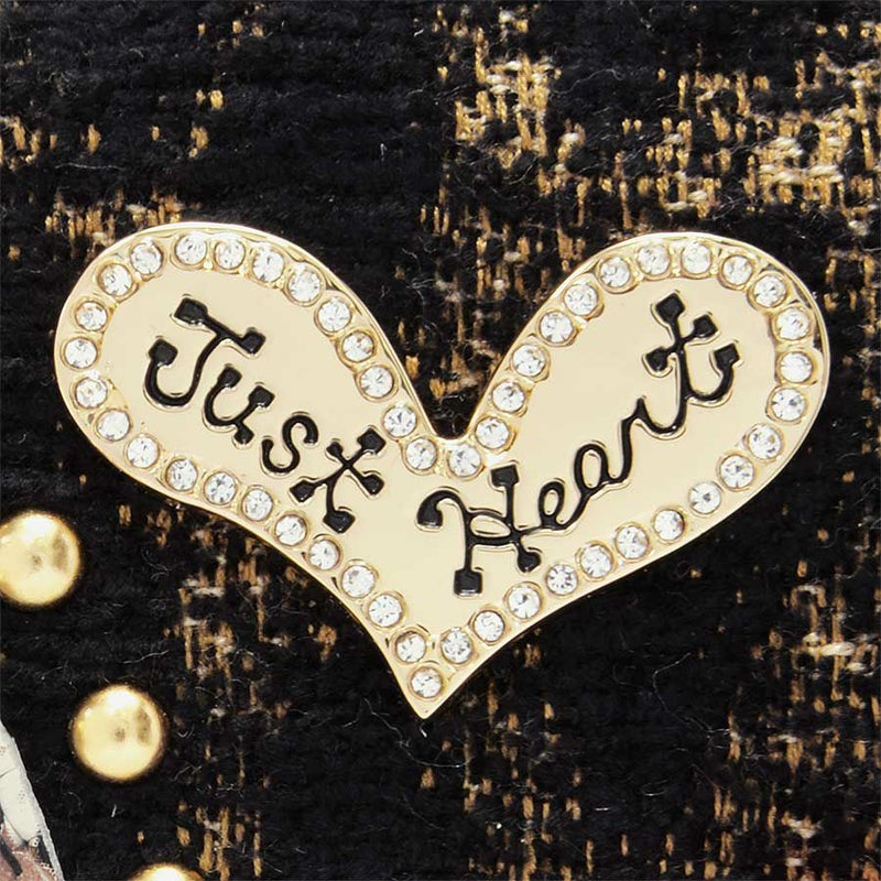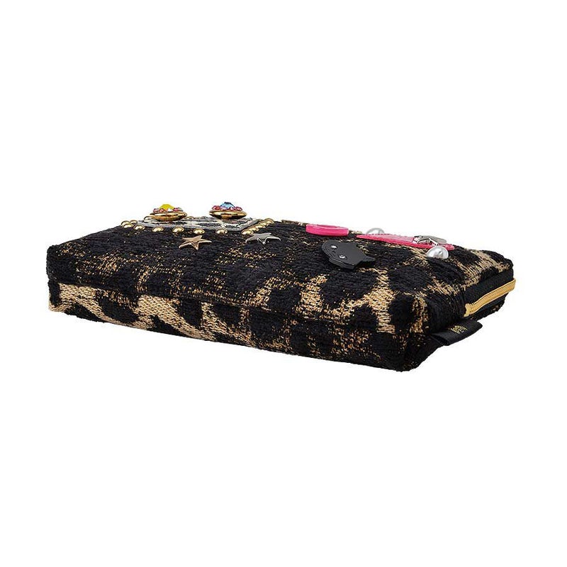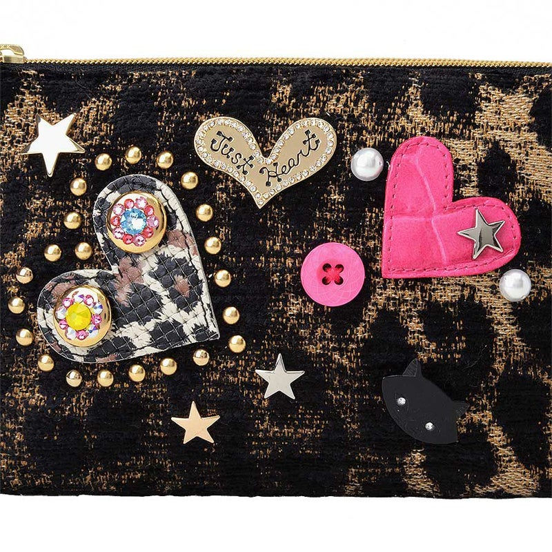 イタリア製レオパード柄のジャカード織生地に、レザーのハートやスタッズなどのモチーフをバランス良く配置しました。