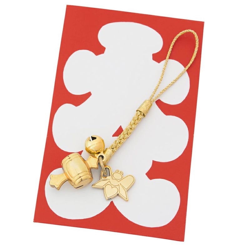 ゴールドの蜂・打ち出の小槌・鈴と、幸運をもたらすと言われるモチーフが付いたオリジナルチャーム付き。